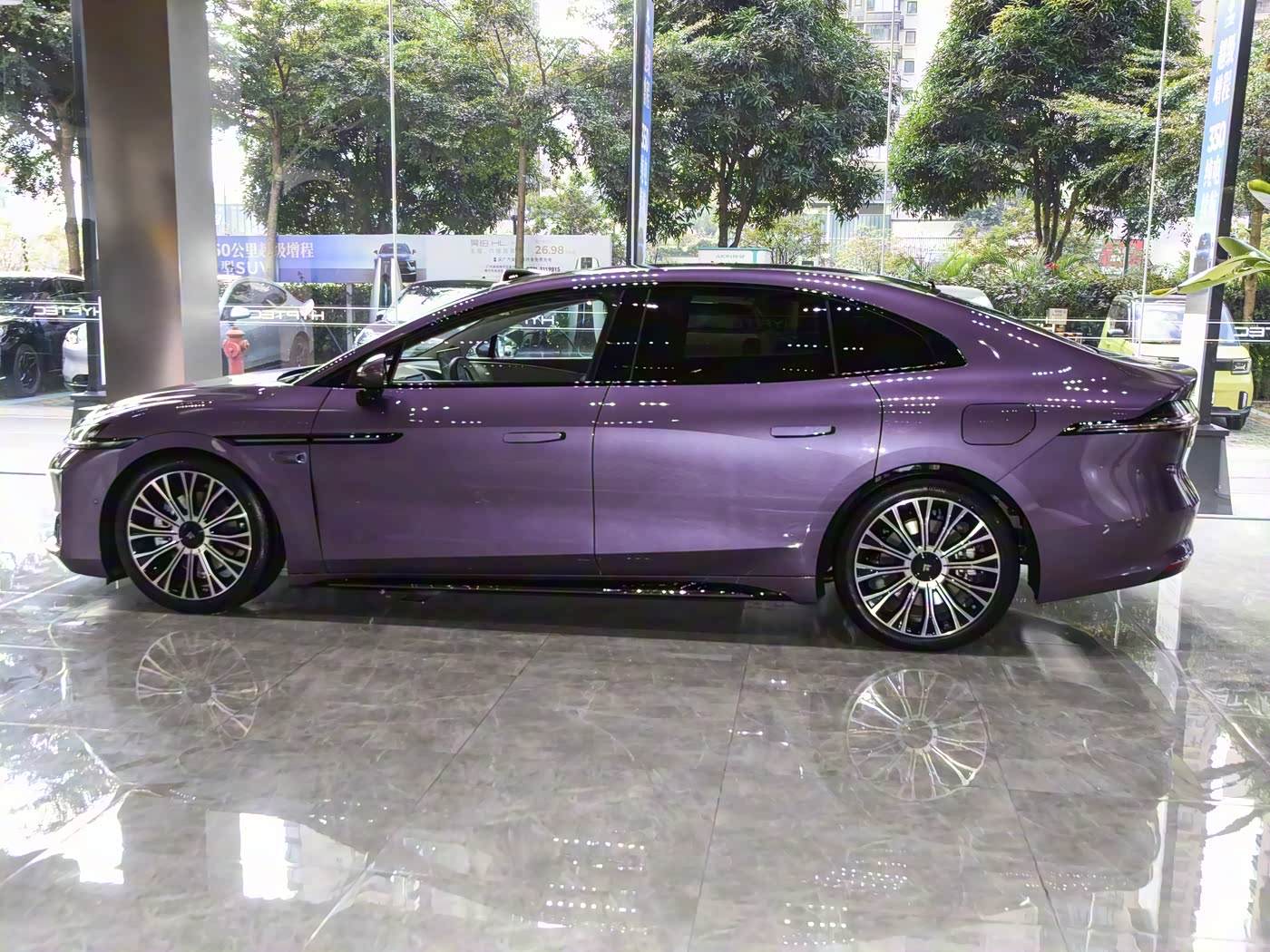 再来看车身侧面部分,车身尺寸为5130mm×1966mm×1500mm,轴距达3020mm,1.31倍的黄金宽高比赋予其宽体低趴的轿跑风格。溜背式设计搭配隐藏式门把手,风阻系数降低明显,C柱导流鳍片进一步提升了行驶稳定性。20英寸“大饼”轮毂提供行政商务与运动两种风格选择,无框车门则增添了高级感。车身配色包括水晶紫、极地白等6款,满足个性化需求。