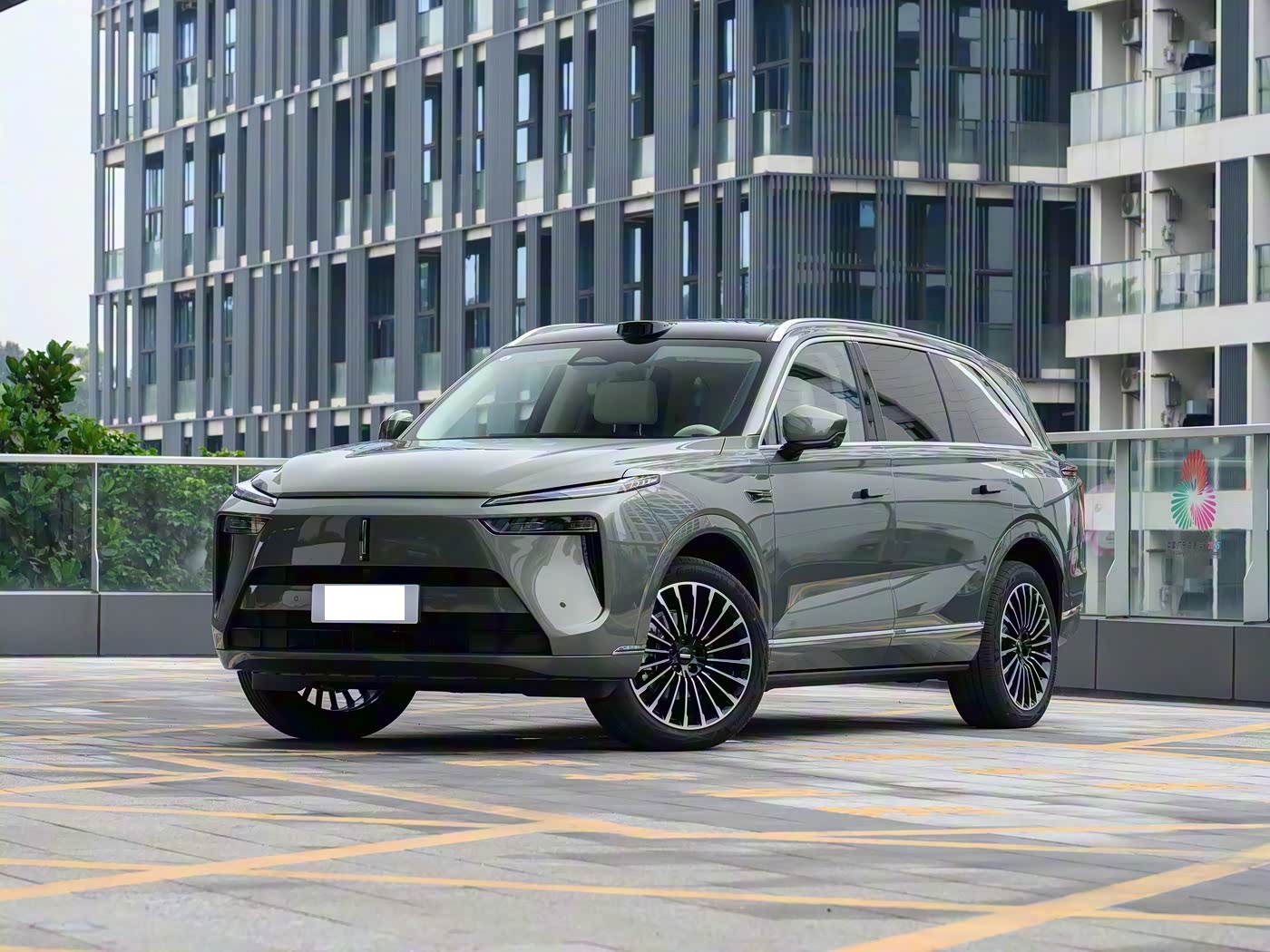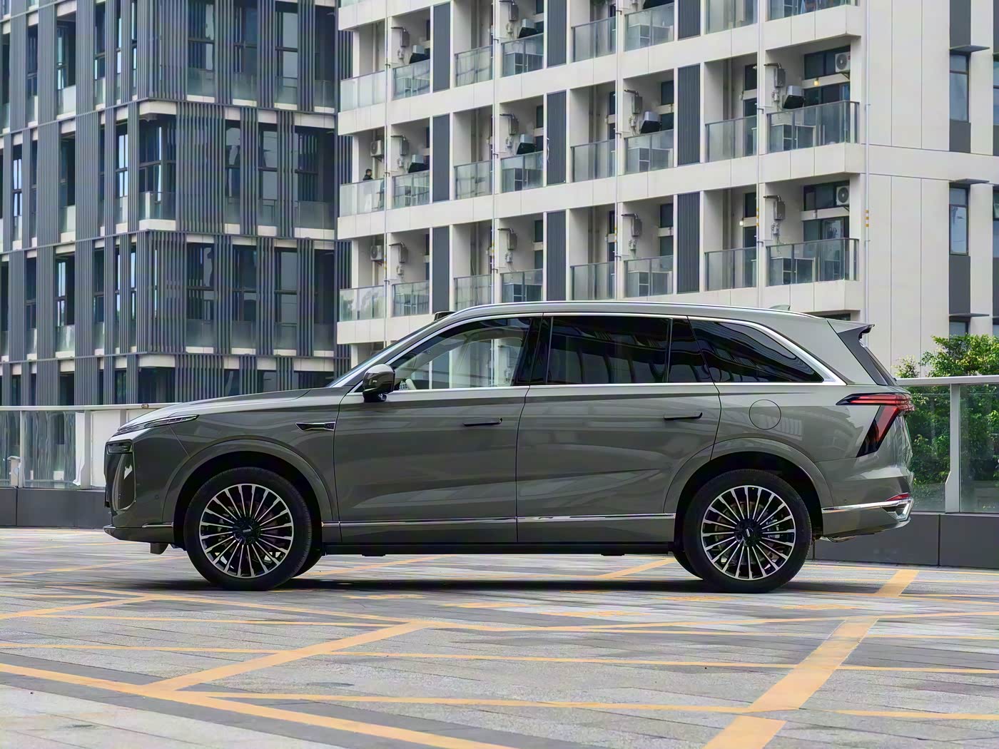 再来看车身侧面部分,车身侧面以流畅的线条勾勒出修长轮廓,双色涂装营造出悬浮式车顶效果,隐藏式门把手不仅降低风阻,还提升了整体质感。 尺寸方面,新车长宽高分别为5156/1980/1805mm,轴距达3050mm,为六座布局提供了充裕的基础。 21英寸密辐式轮毂搭配电动脚踏板(下沉5厘米设计),兼顾了视觉张力与实用性,尤其方便老人儿童上下车。 车顶的鲨鱼鳍天线和粗壮行李架,则进一步强化了其户外探险的基因。