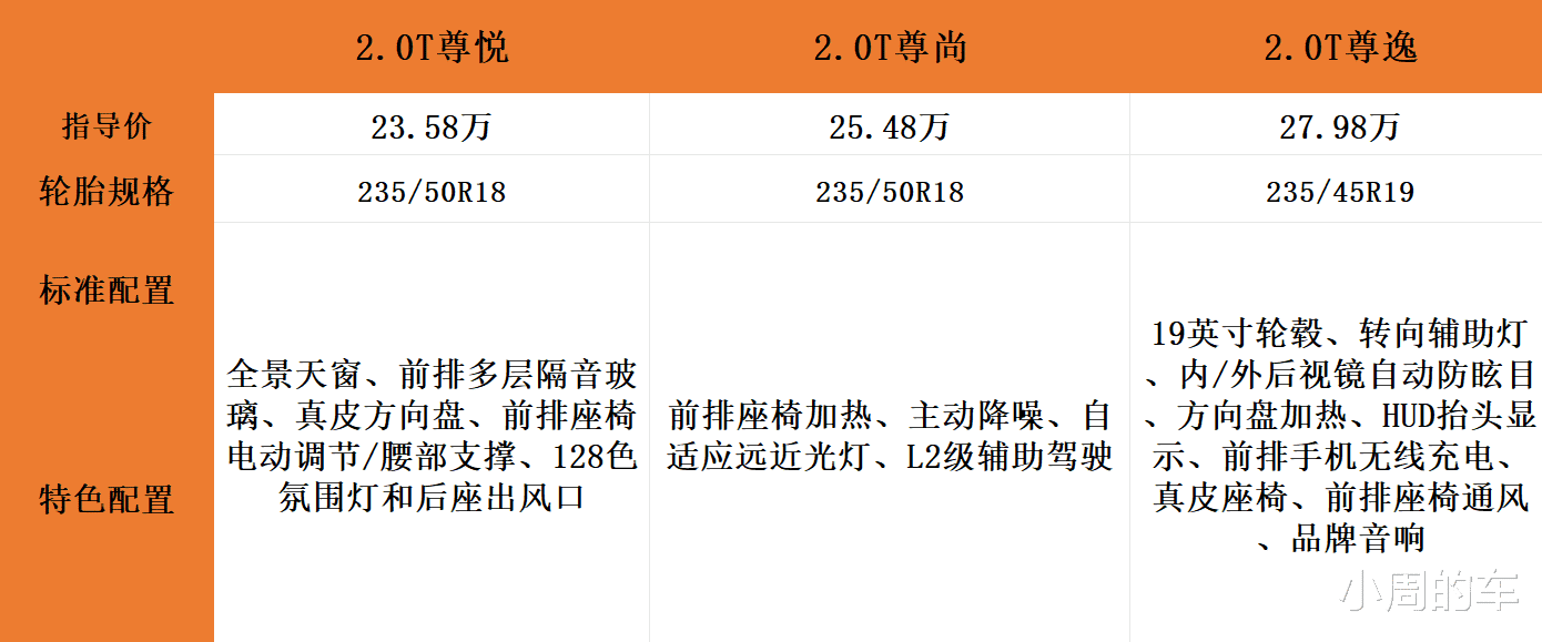 先来看2.0T动力版本的三个配置,它们分别是2.0T尊悦版、2.0T尊尚版以及2.0T尊逸版。