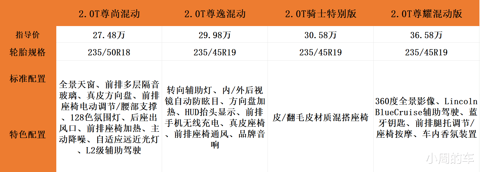 指导价30.58万元的2.0T骑士特别版在2.0T尊逸混动版的基础上贵出了6000元,差别只是座椅材质的不同,这边顶配的2.0T尊耀混动版本指导价格高达36.58万元,比2.0T骑士混动版贵出6万元,只换来了360度全景影像、Lincoln BlueCruise辅助驾驶、蓝牙钥匙、前排腿托调节/座椅按摩和车内香氛装置,更多的是为了拉高品牌调性而存在。