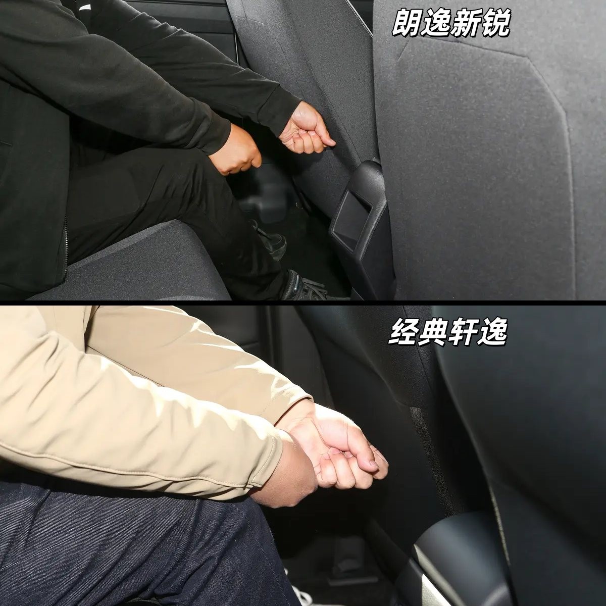 在实用性方面,朗逸新锐的尺寸小一些,长宽高4561x1740x1470mm、轴距2651mm,比经典轩逸的4631x1760x1503mm、轴距2700mm完全小了一圈。但说实话车里的空间差距还真不是很大,同样是175cm的体验者调整好主驾,来到后排乘坐的时候头顶空间都是1拳,腿部空间都还有2拳多。