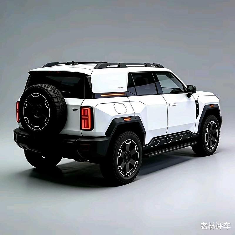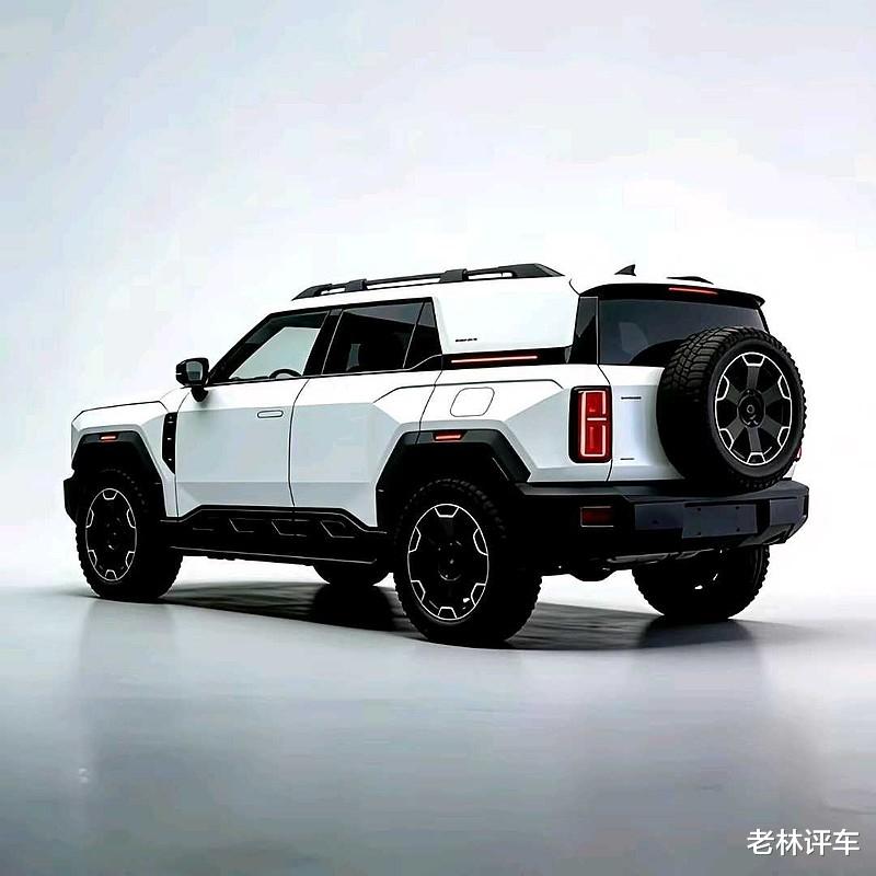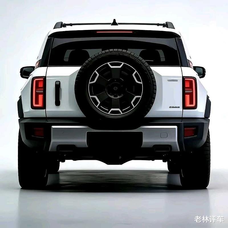 车尾部分,该车配备了外挂式备胎,连个备胎罩都没有,显得十分狂野。该车的尾灯上下并排,后备箱从一侧开启,后保险杠往外隆起,可以起到防护作用。整体来看,该车的车尾设计十分简洁,所营造的视觉效果还是很不错的。