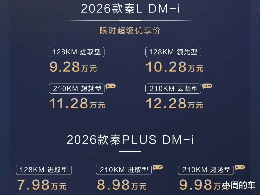 再看比亚迪,就在昨日,2026款秦PLUS以及秦L的插混版本推出了210km纯电续航版本,综合续航高达2110km。值得一提的是,秦PLUS DM-i 210km进取型的指导价“仅”为8.98万元,又是一次加量不加价的升级。