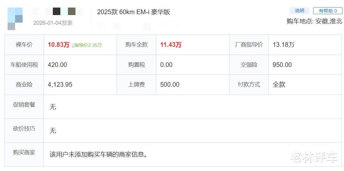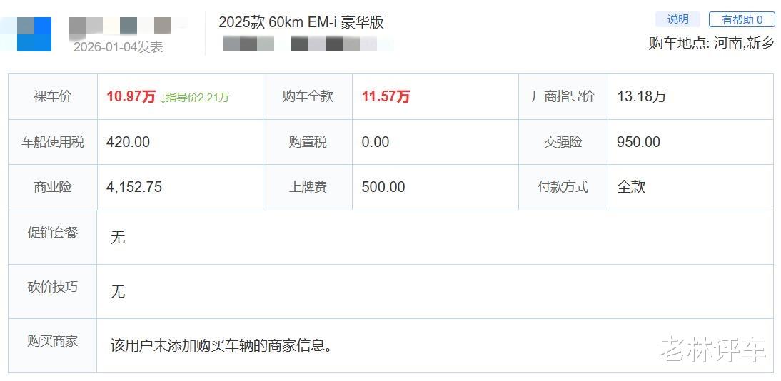 直接看价格,根据安徽淮北和河南新乡的两位银河星耀8车主提供的信息来看,这款车的优惠力度在2.21-2.35万元之间,要知道他们选择的并不是标配车型,而是13.18万元的60km EM-i豪华版,淮北车主的实际价格为10.83万元,新乡车主的实际价格为10.97万元,如果是标配车型的话,实际价格还能更低一些。因此,10万多是可以买到新能源中大型轿车的。