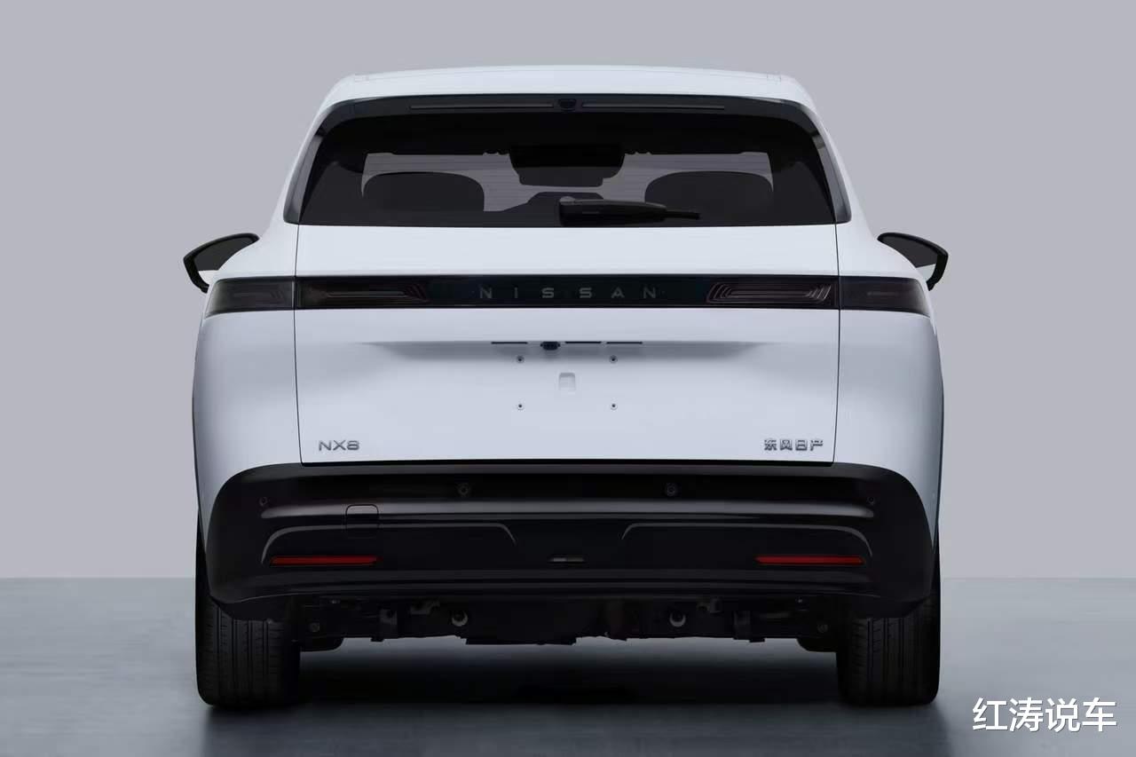东风日产NX8的尾部厚重高大,车顶末端有扰流板和高位刹车灯,贯穿式尾灯由2064颗OLED灯珠组成量子光幕,支持自定义灯语,中间同样融入了“NISSAN”尼桑标识,后包围应用大面积亮黑色材质。