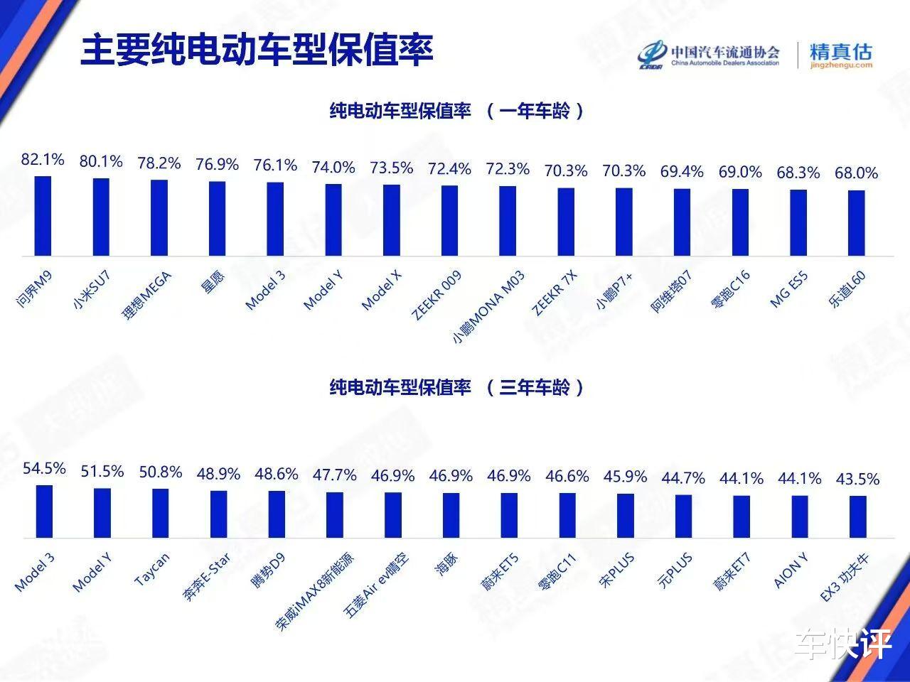 根据中国汽车流通协会公布的2025年12月主要纯电动车型保值率数据显示,一年车龄的小米SU7保值率为80.1%。在纯电动车型中,仅次于问界M9位居第2名。车快评还注意到,即便是特斯拉Model 3一年车龄的保值率也只有74%。单从数据上来看,小米SU7的保值率是要远高于特斯拉Model 3的。