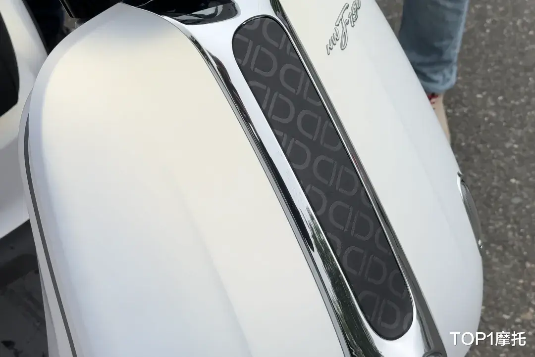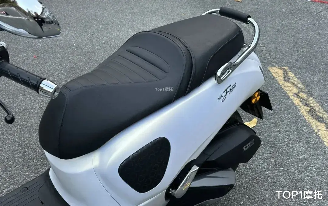 坐垫也有说法,NWF150的坐垫有点上翘,这个是以马鞍为设计灵感,结合踏板摩托车坐垫的造型设计,以达到更加舒适、更加流畅的运动感。同时驾驶位置融入压花的纹理,金属后扶手为全镀铬的表面,并且还在后扶手上给到了一段皮革包裹。