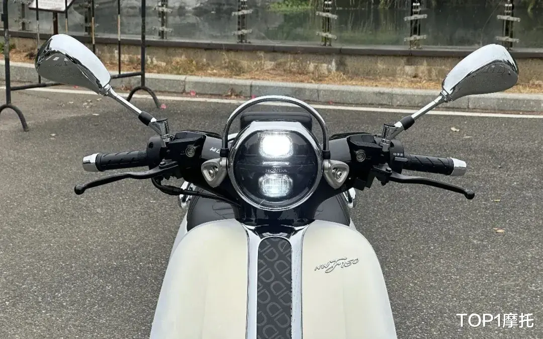车头汇聚的设计元素比较多,镀铬的后视镜的造型,有点高尔夫球杆的意思,小风挡(PRO版本)的造型源自马术帽,风挡金属支架与车身连接部分的金属结构,其造型和后视镜一脉相承。圆形的车灯+镀铬的灯框,也是复古踏板经典的设计语言。