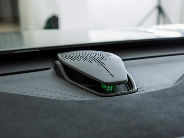 座舱内部采用环抱式设计,方向盘采用平底双幅式设计,有一定的科技感。中控台上配备一块大尺寸的半悬浮式液晶仪表盘,屏幕的右侧能够看到带有纹理的黑色镜面装饰板,并连接了空调出风口,增加了座舱内的档次感和设计感。在中控屏幕的后方,能够看到类似战舰造型的装饰件,这是车内全新的氛围灯设计,内部配备有光源,能够根据车辆的驾驶状态进行灯光方面的联动,也支持最多64色灯光调节,为座舱内营造出独特的驾驶氛围。
