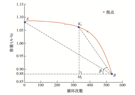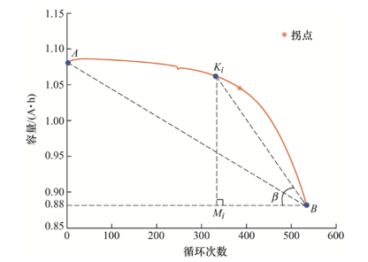 将容量衰退起点设为 A ,终点设为 B, AB之间划一条直线,接着将容量衰退曲线上的每一点 K与寿命终点 B,形成线段 KB,并将 K 点投影至 x 轴得投影点 M, 连接 KM。将∠KBM 定义为容量跳水角 β,将容量跳水角 β 的正切值定义为容量的跳水度 TDR。即TDR= tanβ=KM/BM。TDR 越大,表示电池容量衰退和老化速度越快,非线性程度越强,安全性越差。