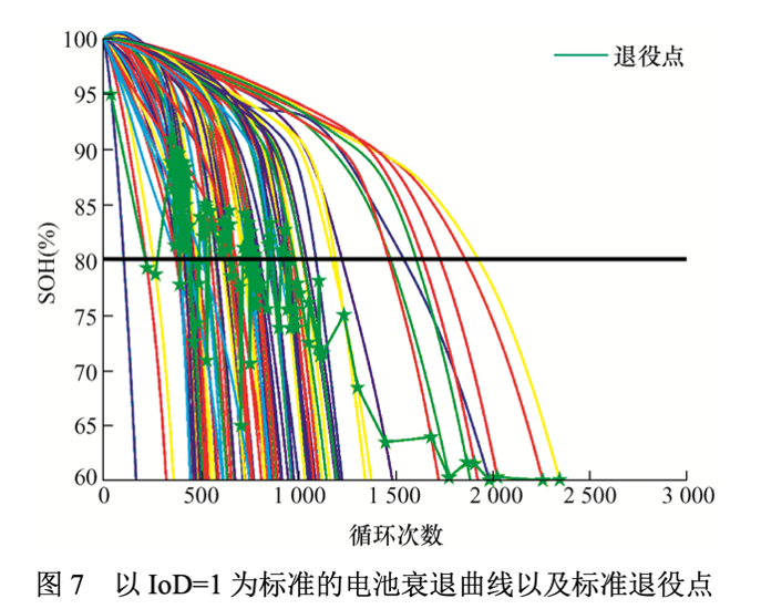 文章中通过对124节磷酸铁锂18650电池IoD的验证,以IoD=1作为电池退役点,得出结论如下图。黑色直线为电池SOH=80%的传统退役标准,绿色五角星标为实际退役点。能看到部分电池循环500-1000次,SOH仍有80%-90%时,实际就应该退役了。而部分电池SOH低于80%,极端的甚至循环到接近2500次,SOH最低到60%,才到实际退役点。