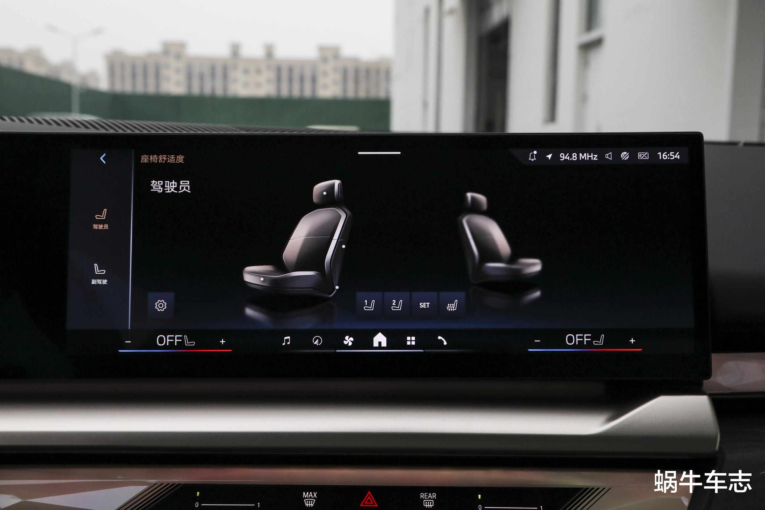 三是中控区域的科技氛围是全系一致的,12.3英寸仪表盘+14.9英寸一体式曲面屏,iDrive 9系统与高通骁龙8155P芯片,支持车道级导航与连续语音控制。舒适配置上前排有加热功能。