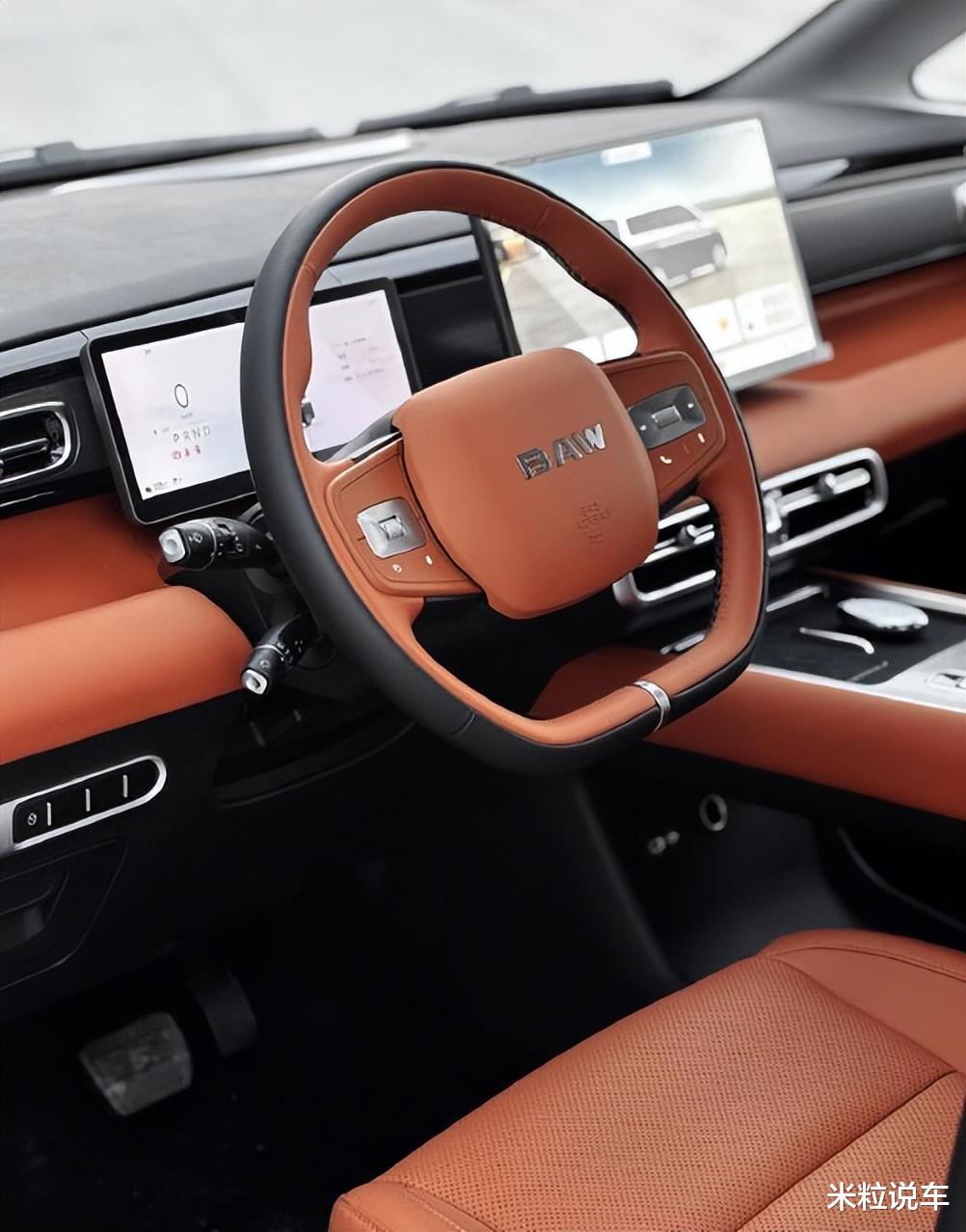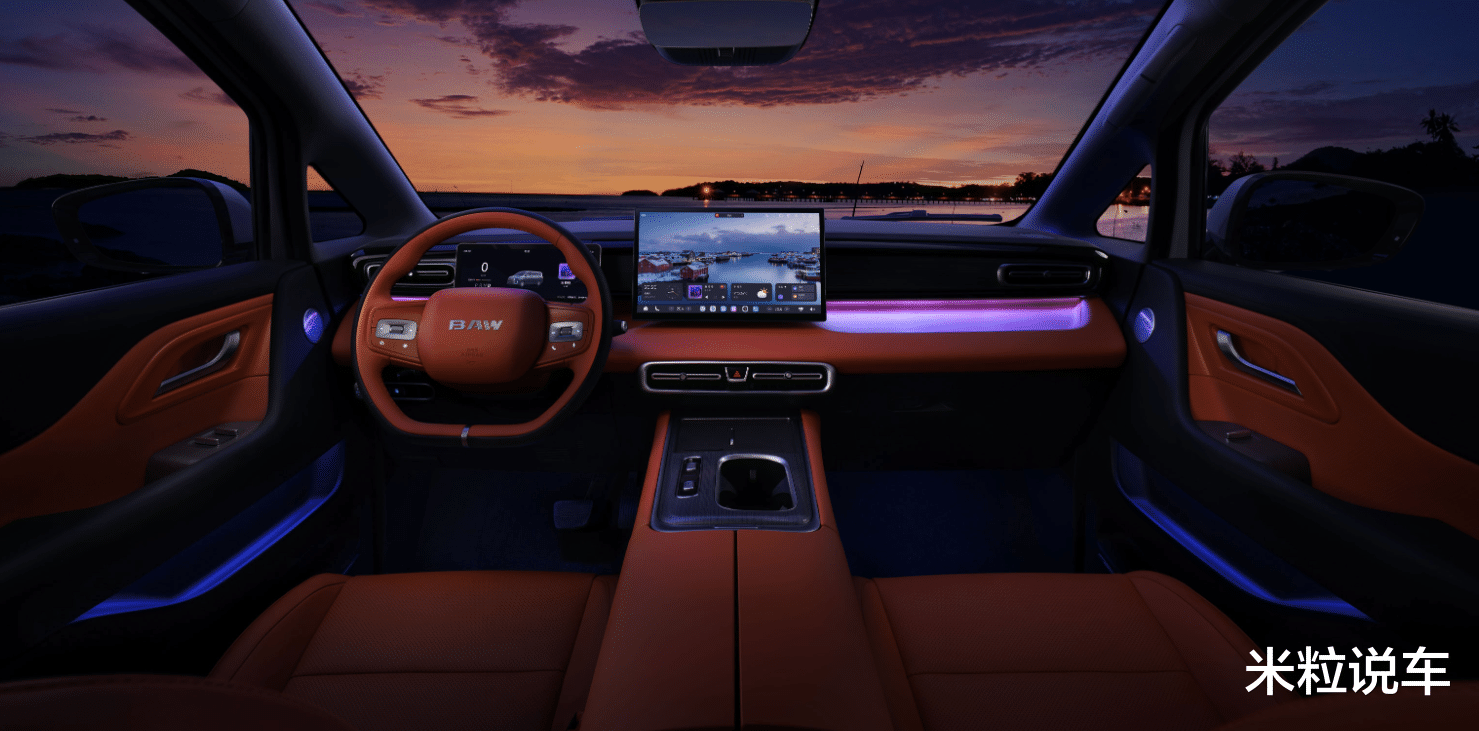 至于内饰设计,主推的就是这种偏向橙色的内饰设计,橙色造型看起来还是有着一定档次感的。除此之外,还采用了双悬浮屏幕设计,而且屏幕支持手机互联系统,语音识别控制系统。值得一提的是,这款锐胜M8新能源还搭载了高通骁龙8155的芯片。