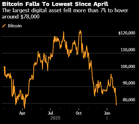 比特币周六下午早些时候在纽约大幅下跌,跌破8万美元大关,跌至2025年4月以来的最低水平。