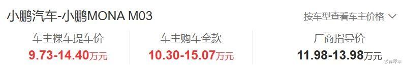 小鹏MONA M03售价11.98-13.98万元,车主提车价为9.73万元起,标配车型优惠了2.25万元,可能有人觉得这样的价格不太现实,可如果你加上报废补贴或置换补贴呢?只能说办法总比困难多。