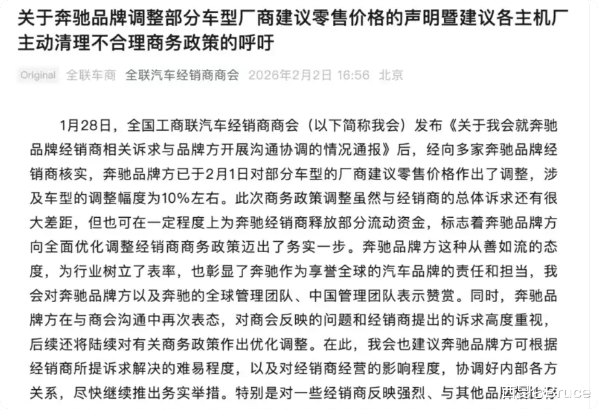 2月2日,全国工商联汽车经销商商会发文确认,奔驰品牌方已于2月1日对部分车型的厂商建议零售价格作出了调整,涉及车型的调整幅度约为10%左右,主要涉及奔驰C级、GLC以及GLB。
