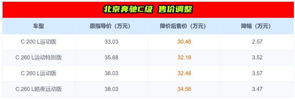 具体来看,奔驰C级4款车型官降2.57-3.47万元不等,降价后新车最低配车型售价来到30.46万元起步。