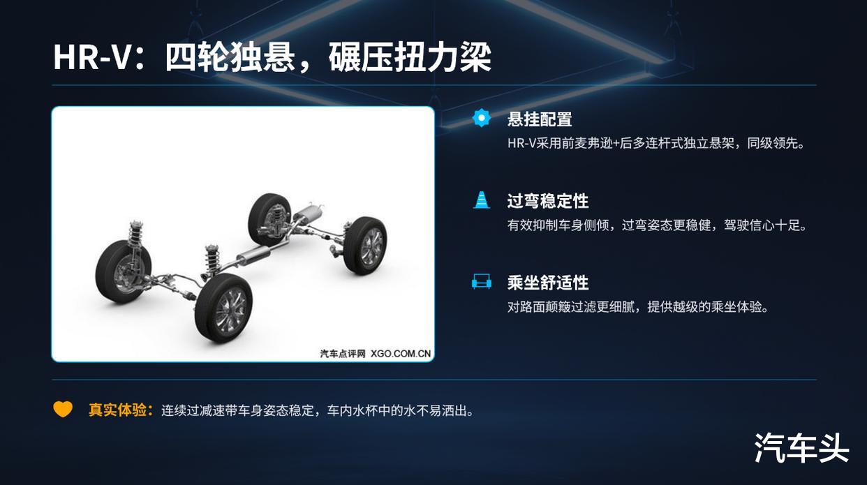 东本HR-V采用的是前麦弗逊+后多连杆式双独立悬架,相比起锋兰达的前麦弗逊+后扭力梁悬架,好得不止一点半点,用料更足,驾驶出来的质感肯定是完全不一样的!