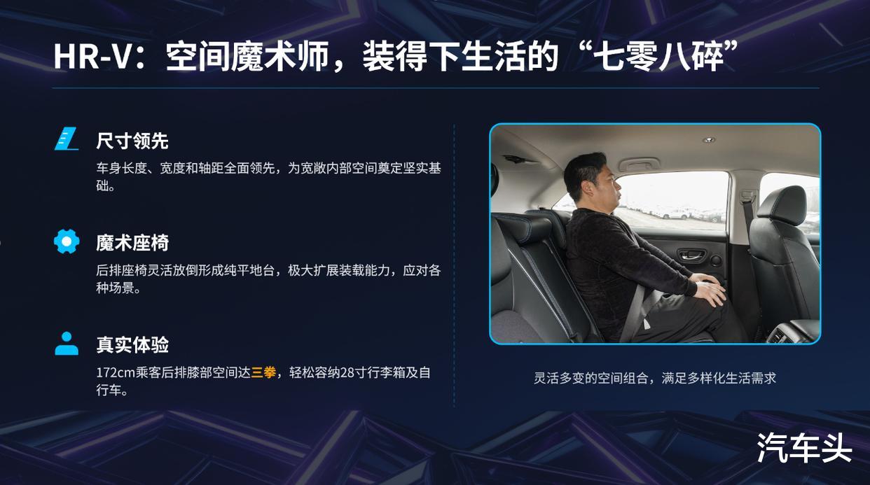 家用车的空间,得看能不能装下实实在在的东西。我 172cm 身高,把 HR-V 驾驶座调好,后排膝盖离前排还有三拳,爸妈坐后排腿能伸直。最绝的是它的 “魔术座椅”,如果遇到搬家,把后排座椅一放倒,纯平的地台直接塞进 28 寸行李箱 + 折叠自行车,连朋友的滑板车都能塞在角落。