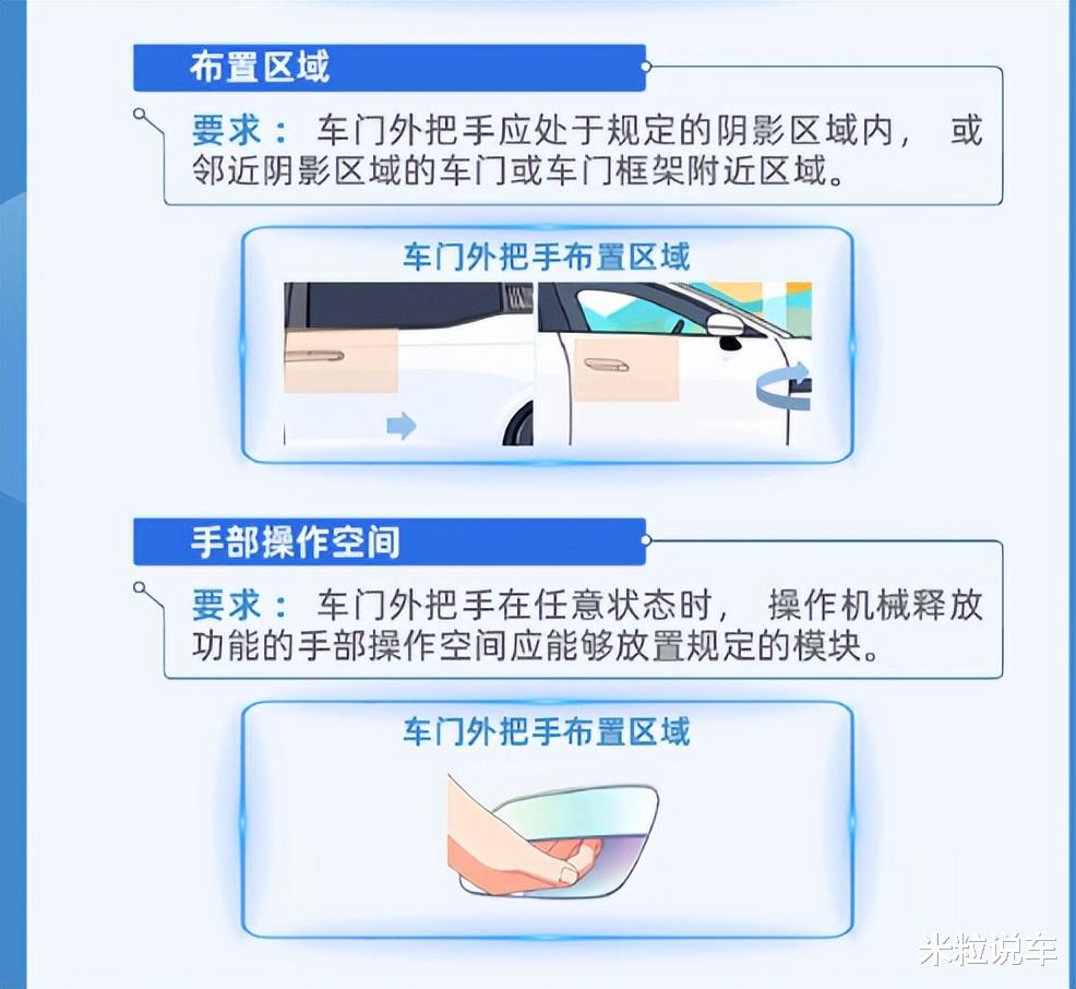 后来一些车企也采用了在新车内部设置紧急机械打开门把手的设计,但是终归治标不治本!所以在这种背景之下,工业和信息化组织制定了强制国家标准《汽车门把手安全技术要求》,并且将会在2027年1月1号正式实施。