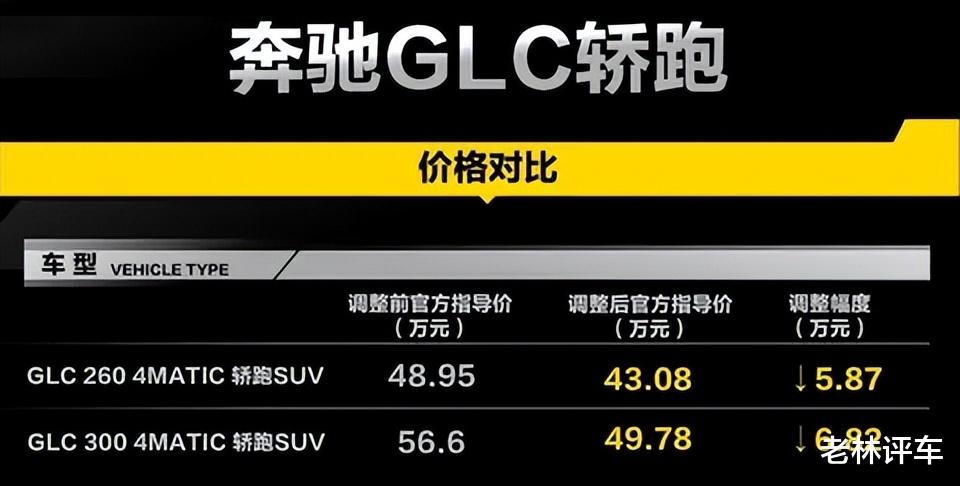 GLC 260降价5.87万元,价格变成了43.08万元,GLC 300降价6.82万元,价格变成了49.78万元。