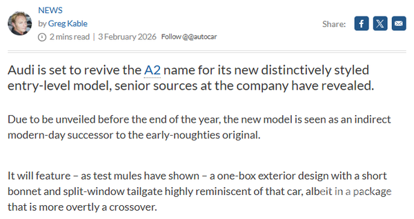 在奥迪的产品阵容中,新款奥迪A2将取代现有的A1和Q2,预计价格起点约为3万英镑(约合人民币29万元),成为奥迪迄今为止最具性价比的电动车型,低于起售价4.7万英镑的奥迪Q4E-tron。该车不仅被视为对标宝马2SeriesActiveTourer的高端小型车,更被视为填补宝马i3停产后市场空白的潜在车型。