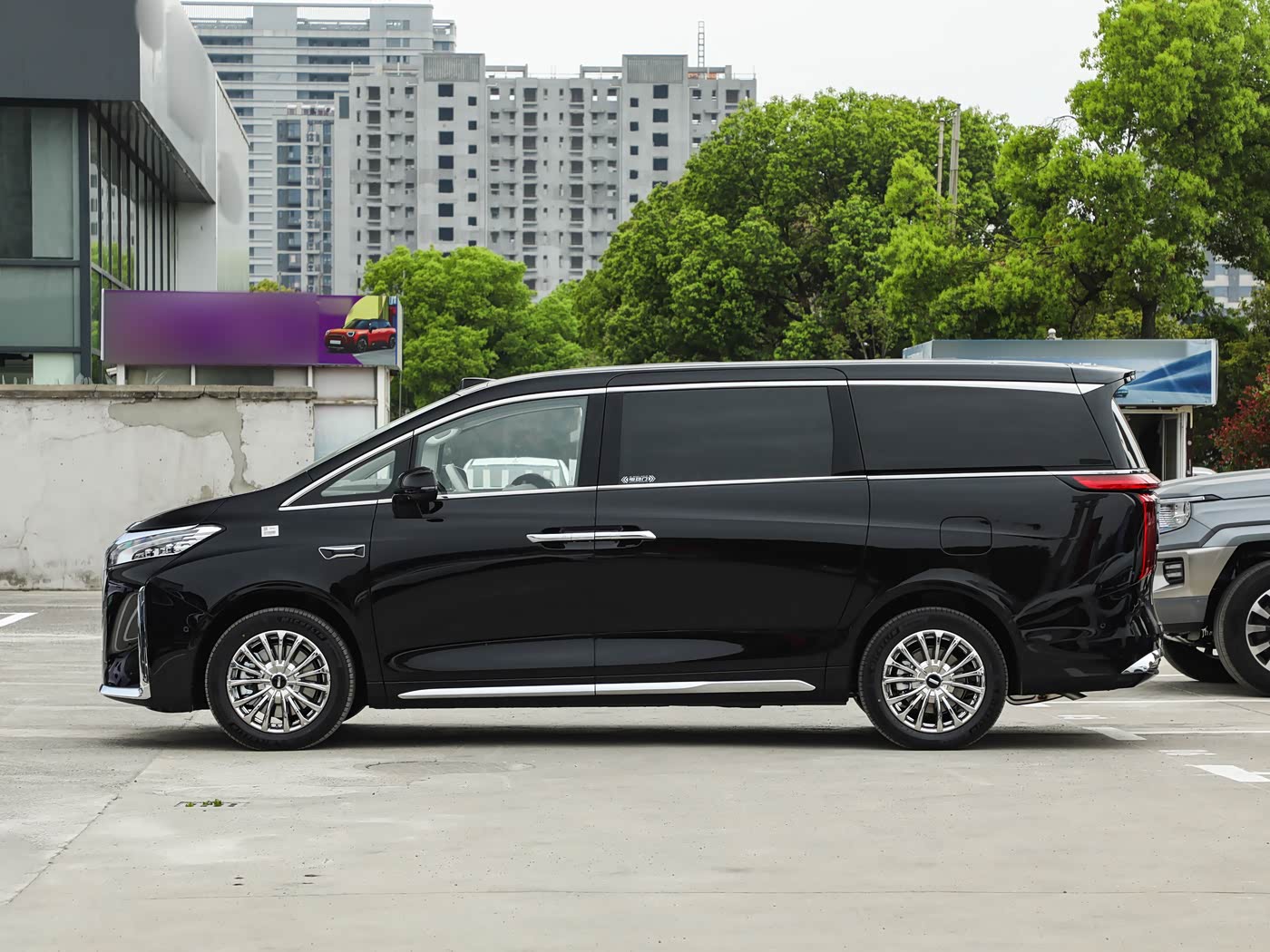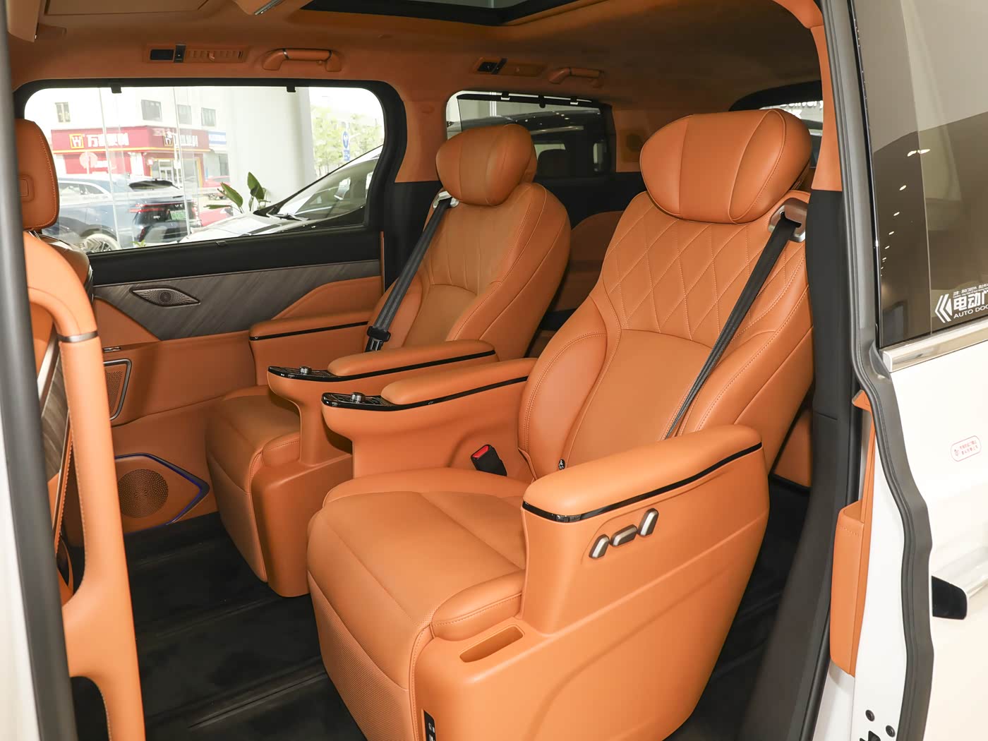 再来看车尾部分,车尾设计延续车头的东方美学基因,整体造型方正饱满,视觉重心沉稳,既符合MPV的实用属性,又彰显中高端MPV的豪华格调。车尾配备升级款“苍松叠翠尾灯”,竖向尾灯与贯穿式LED灯带无缝衔接,灯光点亮时光影如竹影婆娑,尽显中式风骨,与车头星河流光大灯形成前后呼应,夜晚点亮时仪式感十足,车尾采用隐藏式排气布局,下方贯穿式镀铬饰条与车头形成呼应,进一步提升精致度。
