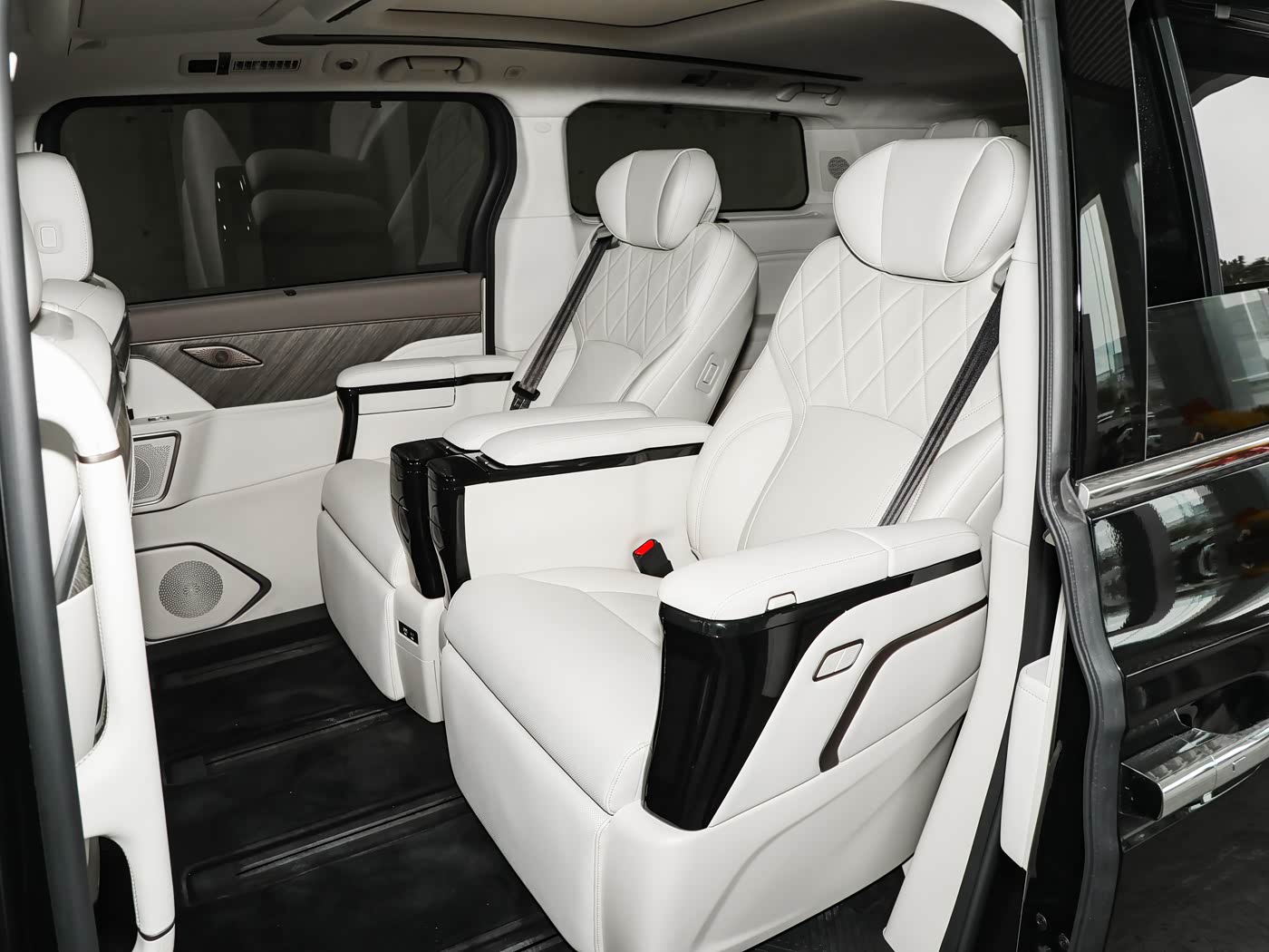进入车内,新车配备12.3英寸2K全液晶仪表+双15.6英寸2.5K中控屏与副驾屏+15英寸SR-HUD抬头显示,形成五屏联动,搭载高通骁龙8295P芯片与Coffee OS 3.2智能操作系统,接入Coffee GPT大模型,操作流畅顺滑,支持六音区语音控制、手势控制、面部识别与多指飞屏操控,空间布局上,新车采用2+2+2六座专属布局,基于超长轴距与新能源专属平台优势,实现纯平地板设计,配备二三排1845mm超长共轨设计,支持大四座与六座模式灵活切换,实用性与舒适性拉满。第二排标配带按摩功能的豪华零重力航空座椅,支持多向电动调节、通风、加热、一键零重力与腿托调节,配备可折叠仿皮包覆桌板,扶手集成座椅控制与多媒体控制按键。