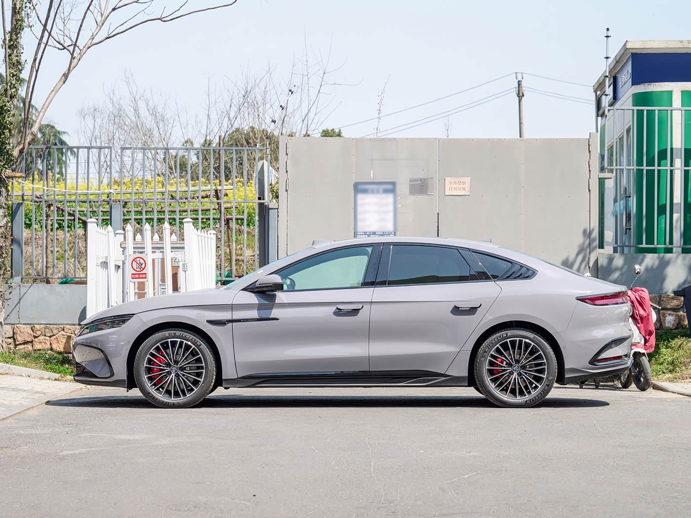 再来看车身侧面部分,车身尺寸维持4995mm×1910mm×1495mm,轴距2920mm,溜背线条从A柱顺滑延伸至车尾,搭配全新19英寸多幅式熏黑轮毂,视觉上更显修长优雅。腰线凌厉硬朗,车窗线熏黑处理强化低趴姿态,隐藏式车门把手与五辐式轮毂呼应,尾部小鸭尾造型增添灵动气质。新增未央灰金属渐变车色,搭配哑光黑化套件(门把手、前后包围),运动版车型全车熏黑加红色卡钳,直接拉满战斗氛围。设计团队通过优化线条与配色,在保证内部空间的前提下,使整车风阻系数降低,兼顾美学与能效。