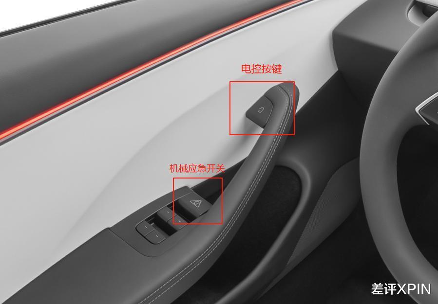 还是拿特斯拉举例吧,Model Y 的前排是一个电控 + 机械的扳手,但是到了后排,机械拉手不翻说明书你都找不到。