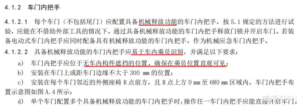 里面明确提到要规范车门内把手,应急把手也应该有易于识别的安全标志,降低乘员紧急情况下的逃生难度。