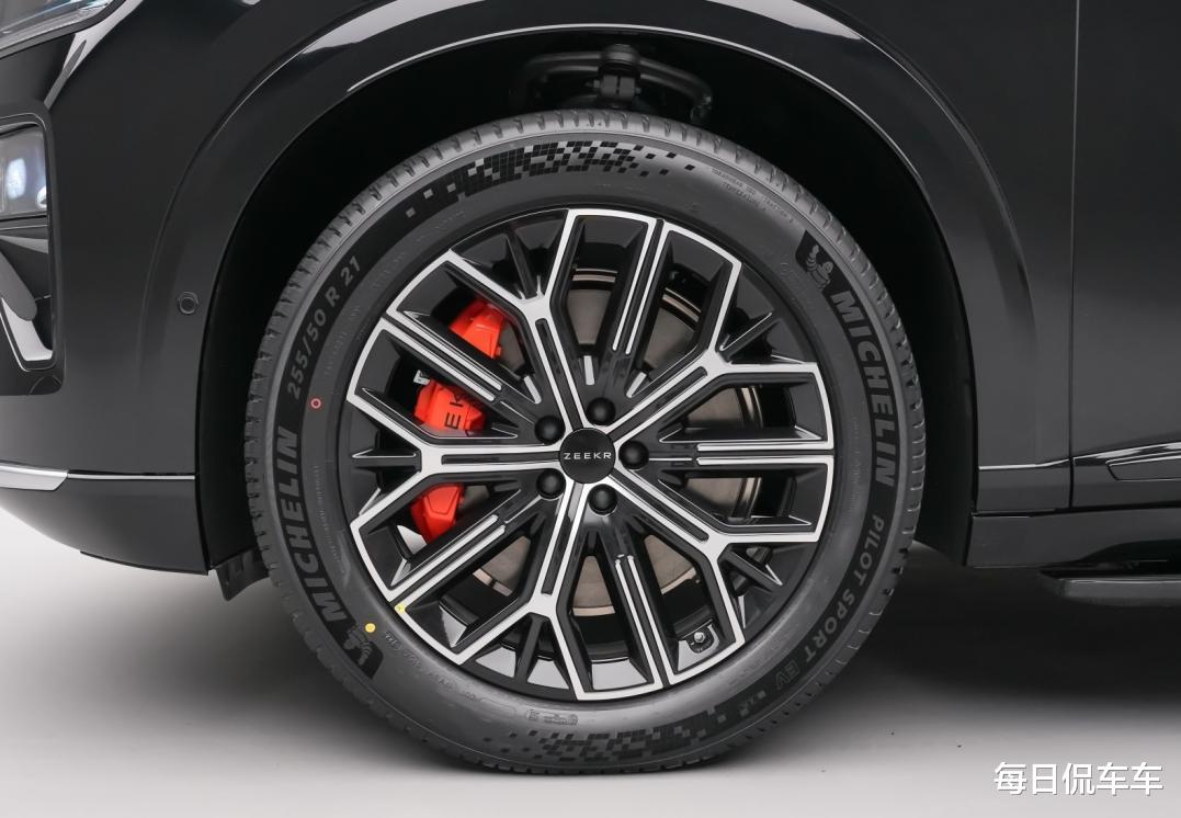 提供20英寸、21英寸、22英寸等不同尺寸轮圈,双色轮圈也很有设计感。搭配255/50 R21的米其林PS4轮胎,后方的红色刹车卡钳格外吸睛。