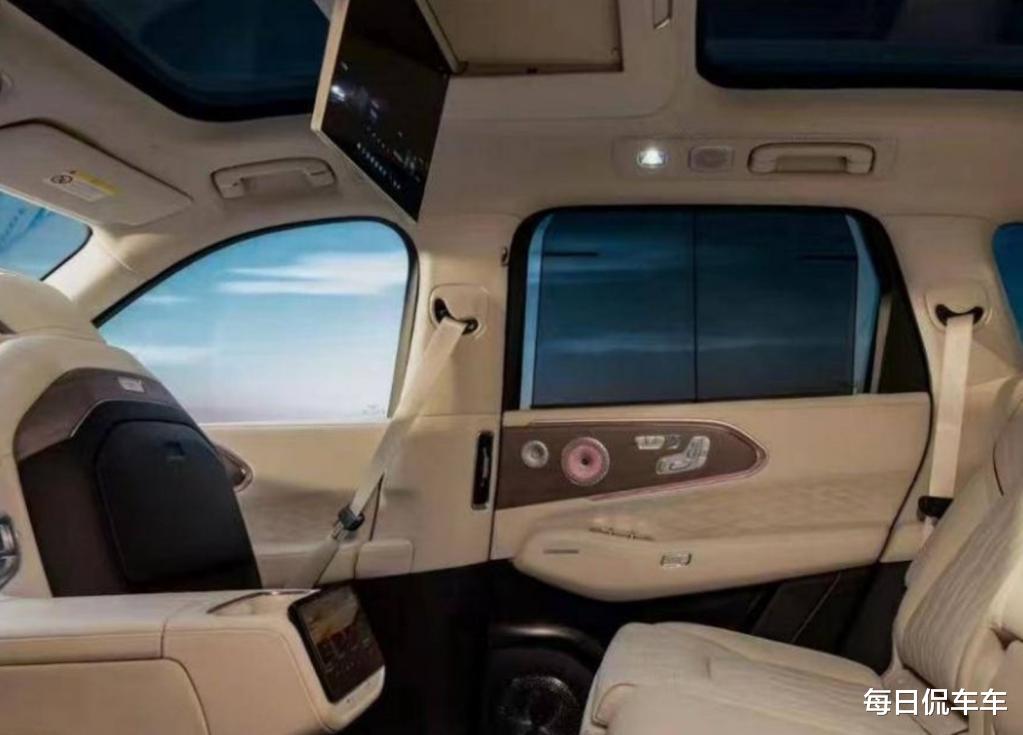 更有看点的是后排空间,右侧配备零重力座椅,打开零重力模式前排座椅可自动前翻腾出空间,五座车布置零重力座椅确实少见。另外,车顶还提供吸顶屏,屏幕位于前后天幕之间,布置的也很巧妙。另外,地台处还有一个屏幕,控制后排各种硬件功能的。后排不仅有隐私玻璃,还有电动遮阳帘。配置上,多色氛围灯、座椅的通风加热按摩、车载冰箱以及多喇叭的高级音响,应该都不会缺席。