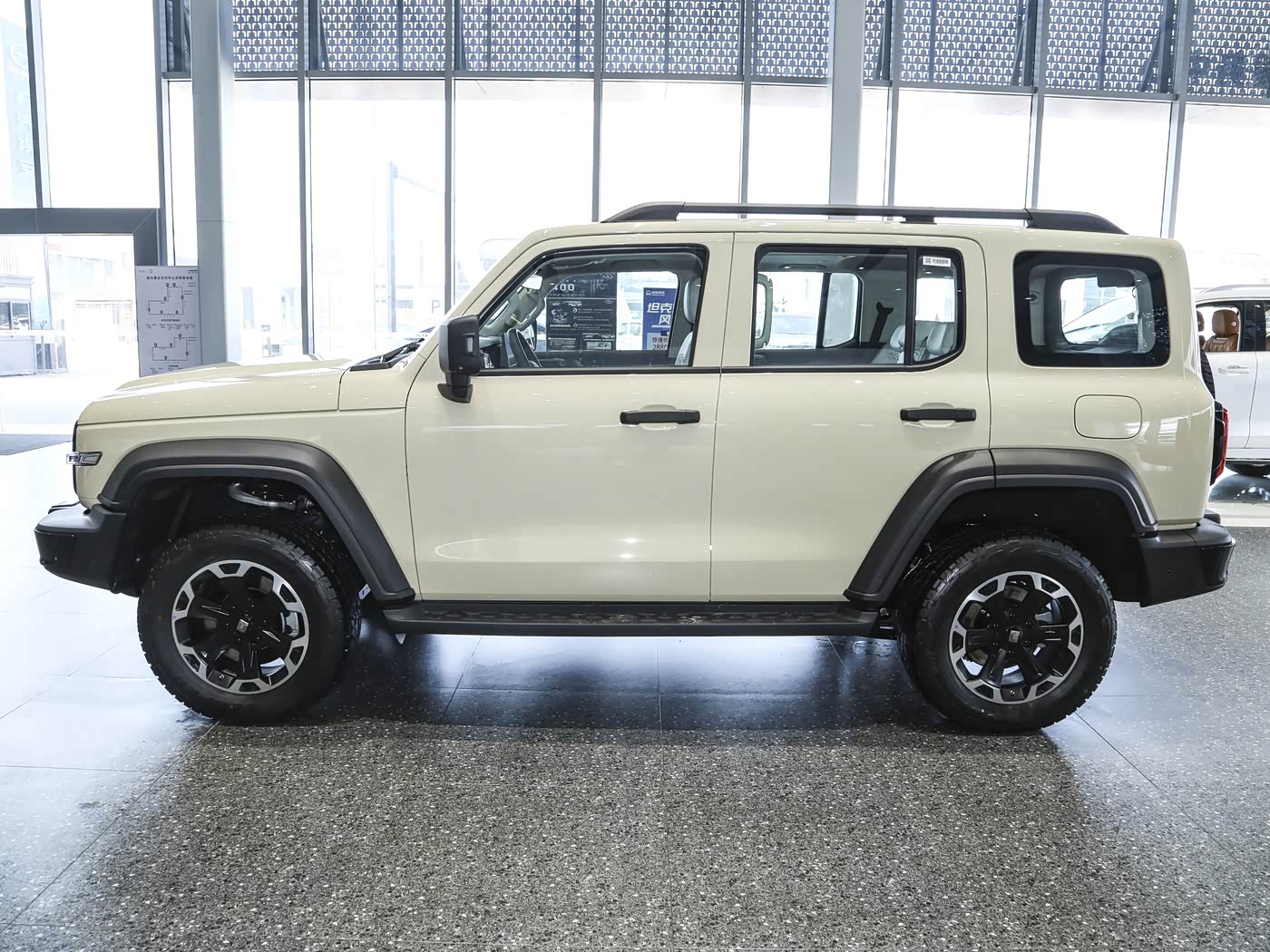 再来看车身侧面部分,车身侧面延续了经典方盒子造型,但通过深沉雅致的腰线与悬浮式车顶设计,弱化了传统越野车的笨重感。4750mm×1930mm×1903mm的车身尺寸与2750mm轴距,在紧凑型SUV中属于主流水平,但19英寸大尺寸厚壁轮胎与外凸式轮眉的搭配,赋予了车辆“小身材大能量”的视觉张力。