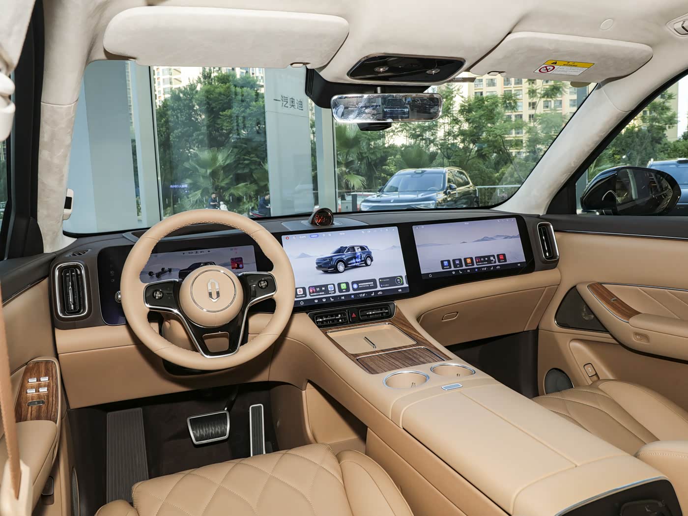 进入车内,问界M8的内饰以“科技赋能豪华”为核心理念,融合简约设计与高端材质,兼顾智能交互、舒适体验与空间实用性,并且配备连体悬浮式三联屏+AR-HUD抬头显示,屏幕显示清晰细腻,内置HarmonyOS 4智能座舱系统,搭载华为芯片,操作流畅不卡顿,支持语音控制、多屏联动与手机互联,响应迅速,可轻松控制空调、导航等功能。空间方面,依托3105mm轴距,有效座舱空间充裕,提供五座与六座两种布局,全系空间基础配置一致,仅布局不同。六座版采用2+2+2布局,二排配备独立零重力座椅,支持多向电动调节与按摩功能,纯平过道方便第三排进出;五座版后排空间灵活,放倒后后备厢最大拓展至2460L,满足储物需求。