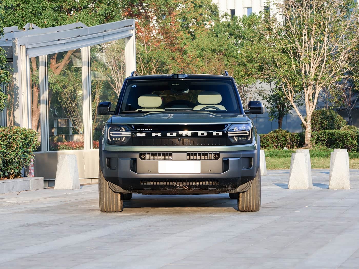 我们首先来看新车的外观设计方面,福特智趣烈马的车头设计延续了烈马家族的标志性元素,同时注入新能源时代的科技感。前脸以贯穿式可发光“BRONCO”字标格栅为核心,搭配圆形数字化大灯,引擎盖采用“Air-Bridge”风道设计以优化空气动力学,粗壮的越野保险杠和拖车钩预留孔彰显其硬派基因。 格栅的发光设计不仅提升辨识度,更在夜间行车时强化品牌记忆点,而大灯组集成LED日间行车灯、自适应远近光等功能,兼顾安全性与美学。