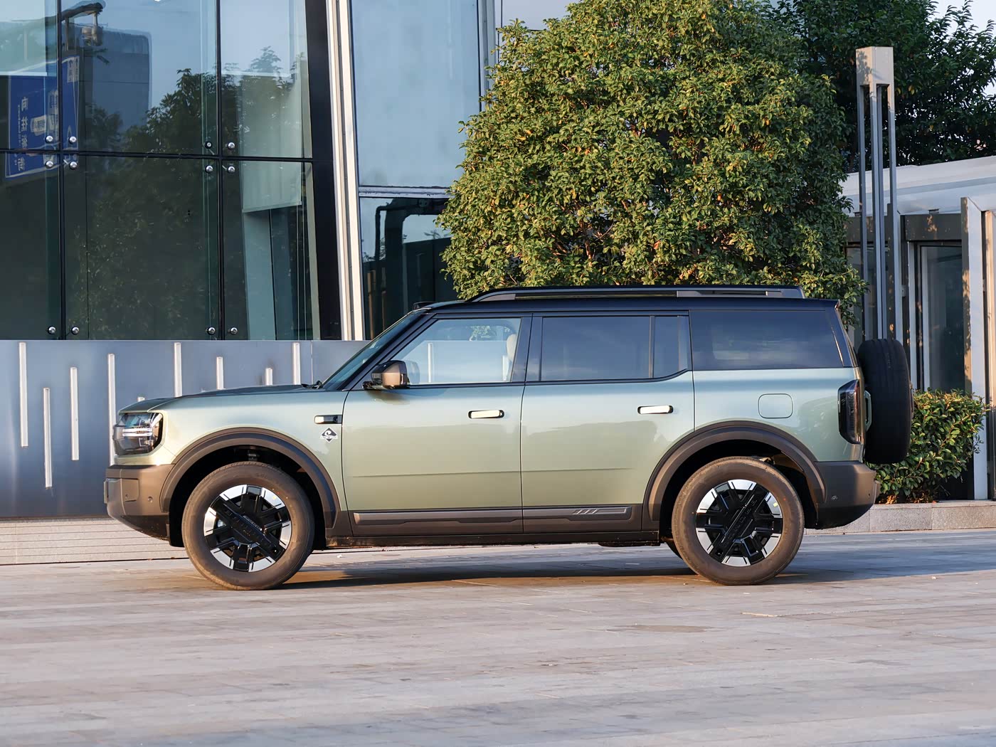 再来看车身侧面部分,车身侧面是智趣烈马“方盒子”造型的精髓所在,线条平直硬朗,悬浮式车顶设计搭配隐藏式电动门把手,营造出时尚与力量感并存的视觉效果。 车身尺寸为5025mm×1960mm×1815mm,轴距达2950mm,长宽比优化后更显修长,避免了传统方盒子SUV的笨拙感。 线性肩线贯穿车身,宽大防刮轮眉采用防护性设计,既增强越野时的耐用性,又提升高速行驶的稳定性。 侧面轮廓简洁而富有张力,隐藏式门把手在降低风阻的同时,也呼应了新能源车型的科技属性。