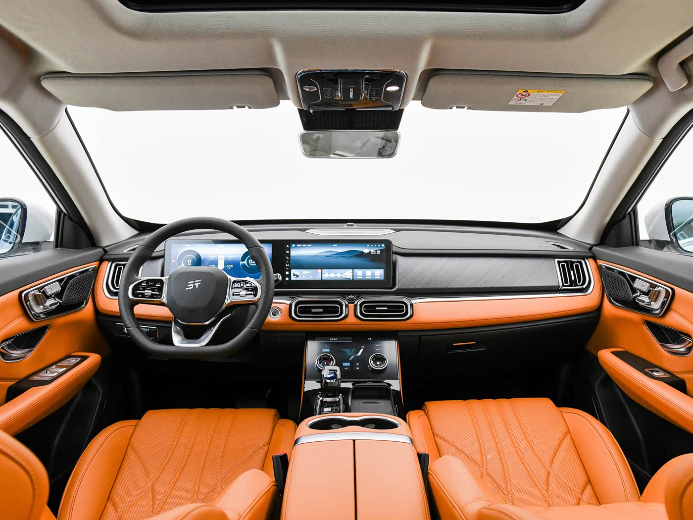 进入车内,捷途X70 PLUS的内饰设计主打科技简约风格,同时兼顾了质感与实用性,完全符合十万级家用SUV的核心需求。中控台采用对称式设计,搭配科技简约仪表台与浮桥式中通道控制区,布局清晰合理,2745mm的长轴距为车内空间奠定了坚实基础。身高175cm的乘客在前排舒适坐姿下,头部仍有一拳余量,而后排腿部空间可达两拳以上,中央地台凸起不明显,中间乘客也能保持舒适坐姿。车型提供5座/7座灵活布局,后备厢常规容积达438L,放倒后排座椅后可拓展至1680L。