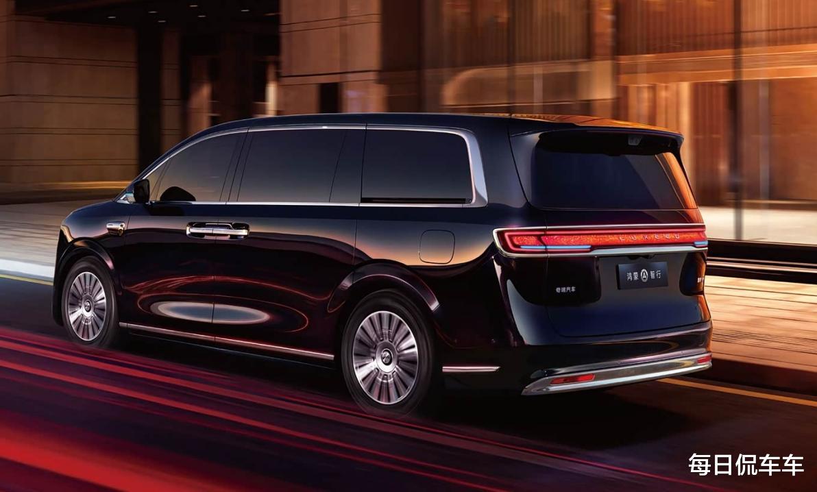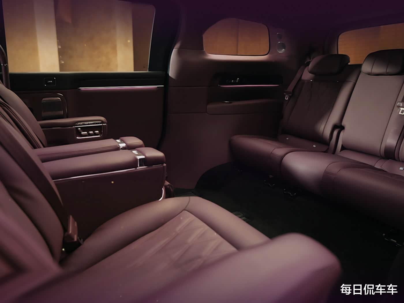 车尾造型略带一点倾斜,车顶也略带下压,不过整体上依然方正,保证空间够大。布置了顶置环绕式尾翼,并将后雨刮隐藏在尾翼下方,使得尾窗干净整洁。贯穿式尾灯依然有很多星钻的装饰,两侧有小蓝灯。底部采用排气管隐藏式布置,增加镀铬条提升精致感。