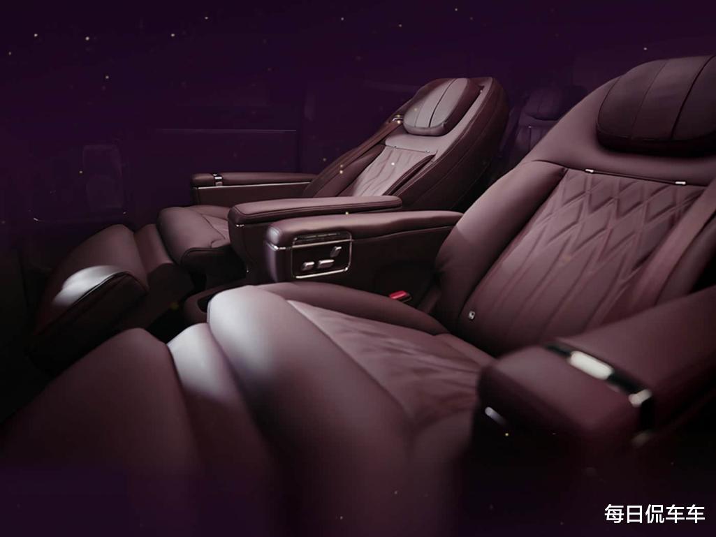 本次中排座椅还有创新,那就是支持底座旋转,可实现45度迎宾、90度向外观景和180度对坐模式。从使用场景看,对坐模式可满足商务用户的开会,也可以满足一家人在车内打扑克或聚餐。从图中可以看到,第三排座椅的高度充分,填充物也比较厚实,而且也是全电动调节。采用4:6分割放倒,空间的灵活性也比较高。另外,车内还提供车载制氧机,到高海拔地区也不用担心,车载冰箱也不会少。