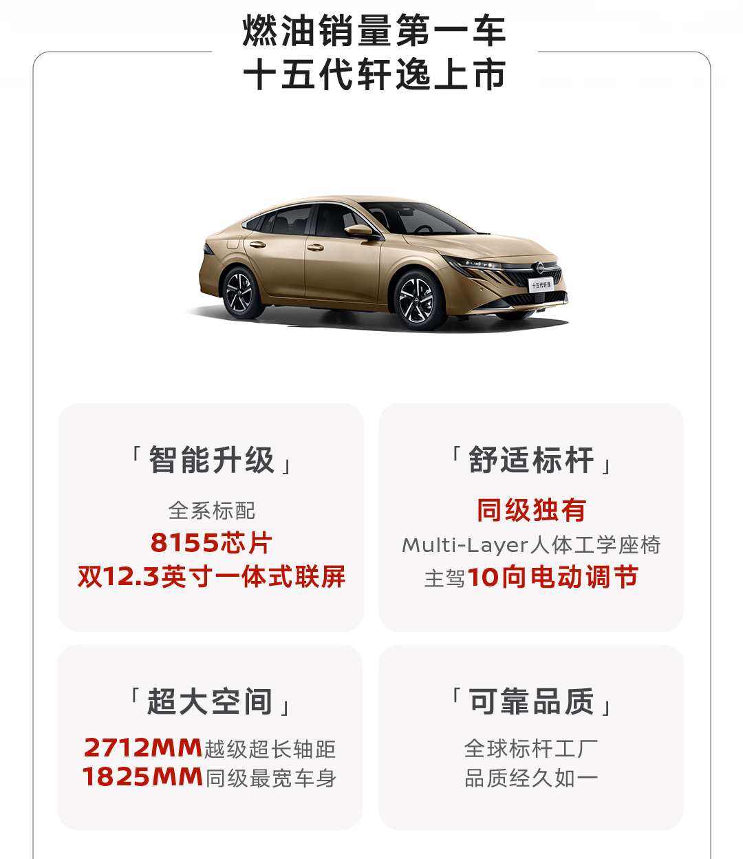 产品层面,除了全新的外观内饰外,第十五代轩逸还做到了智能升级,全系标配8155芯片和双12.3英寸一体式连屏,满足用户对于智能化的追求。