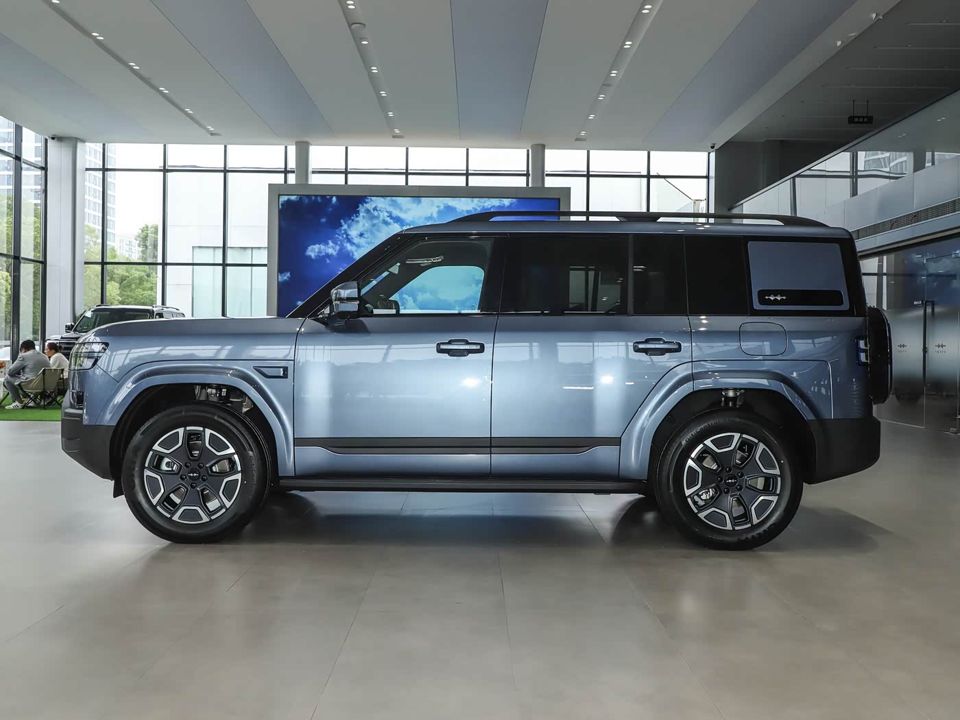 再来看车身侧面部分,车身侧面是钛7“方盒子”造型的核心展现,4999mm的车长、1995mm的车宽与1865mm的车高,搭配2920mm的超长轴距,既营造出媲美硬派越野车的强大气场,又为车内空间奠定了扎实基础。平直的车顶线条贯穿全车,最大程度保留了头部空间,而垂直的车身侧面与利落的折线,让整车轮廓清晰分明,力量感十足。细节设计上,外凸轮拱搭配独特轮毂,强化了硬派越野风格;A柱至D柱的黑化处理的悬浮式车顶,为整车增添了时尚气息。车身侧面的C柱与D柱之间采用半封闭车窗设计,搭配侧裙护板,既优化了通过性,又提升了视觉张力。
