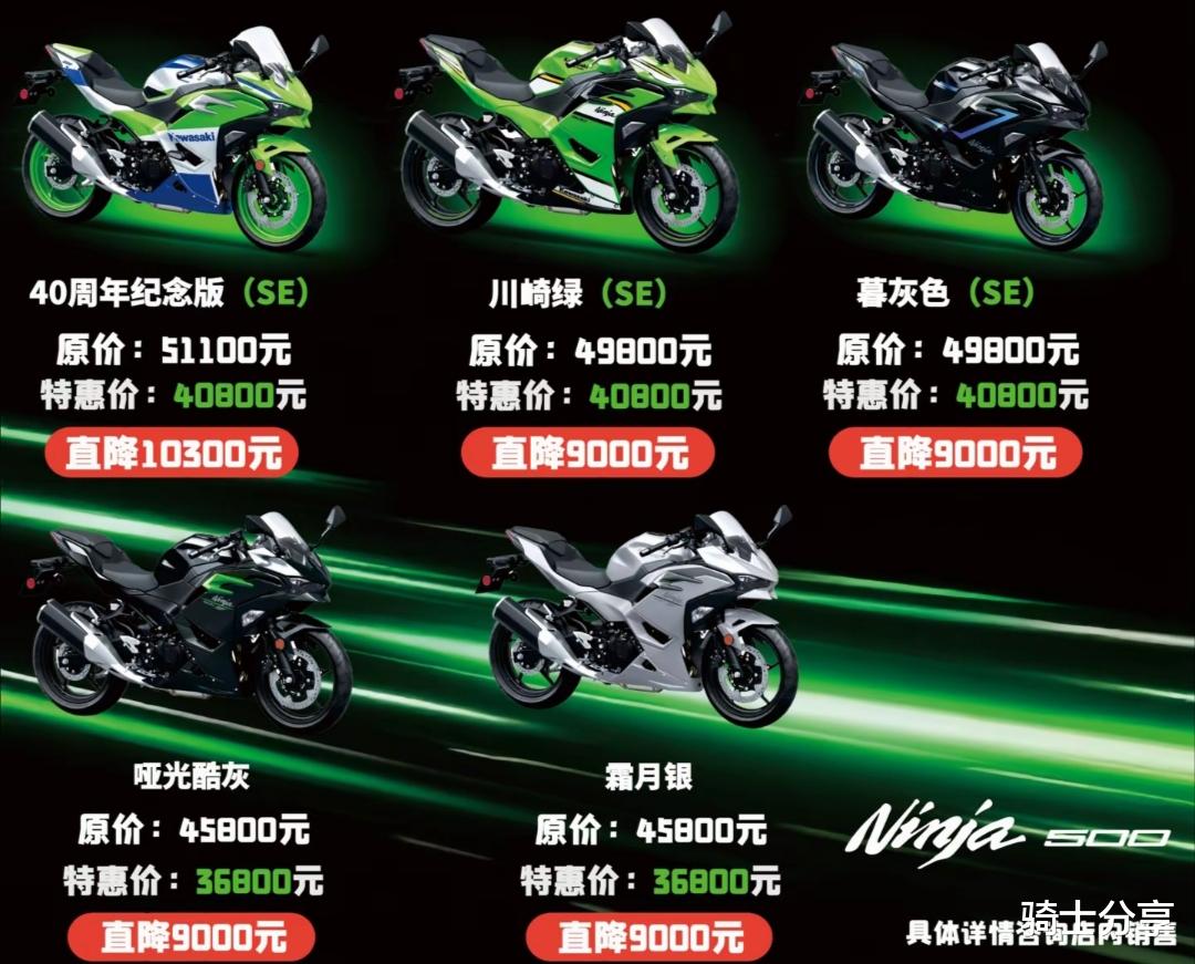目前在内地市场所销售的Ninja500为2024款,该系列会有多个细分版本,其中40周年纪念版特惠价为40800元,降幅达到了10300元,其他不同配色版本降幅为9000元。