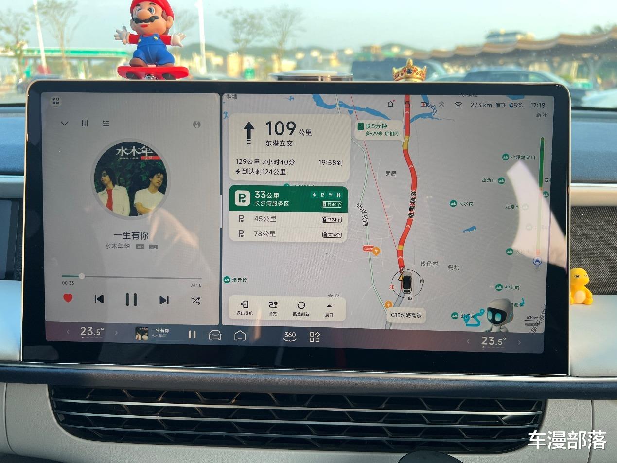 趁堵车,拐进了服务区,此时表显续航还剩273公里,而车辆总里程已经来到了99672km。简单算一下,这一段实际跑了99672 - 99454 = 218公里,而表显续航掉了560 - 273 = 287公里。这一段高速为主的续航达成率大概是218 ÷ 287 ≈ 76%,这个高速表现我觉得完全在接受范围内。