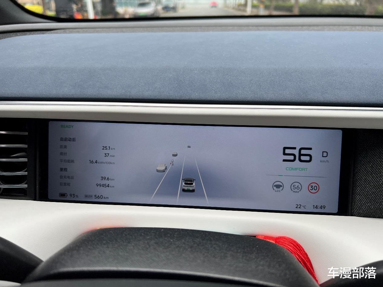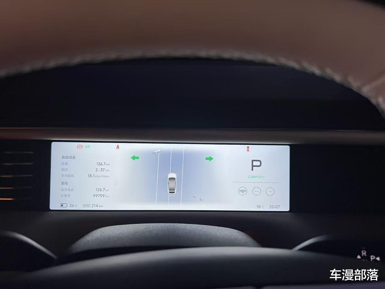 出发前,WLTP续航560公里,车辆总里程99454km。车上一共4个大人,后备箱也是满满的。而且当天温度22度,对电车来说是最友好了。