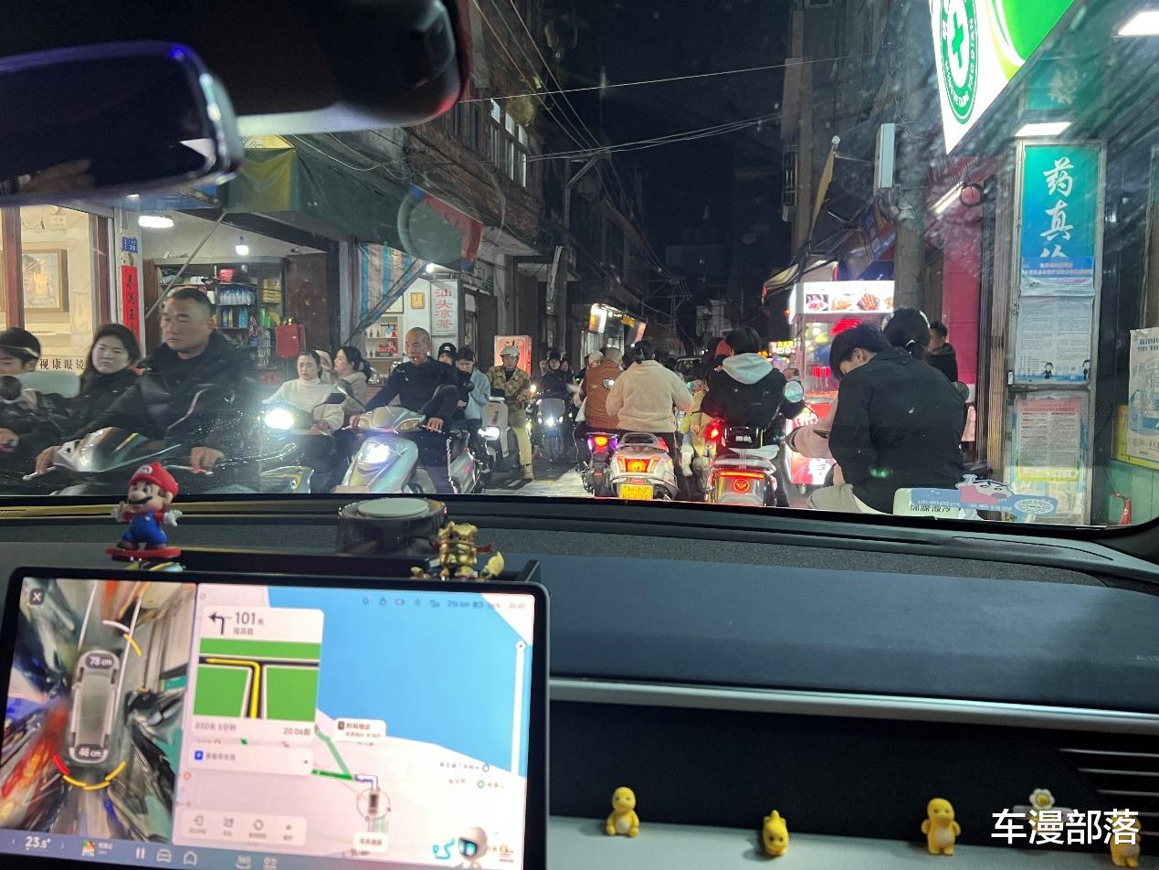 后半段路况变得复杂起来。下高速进了村里,经过了一段拥挤小巷子,前后是连绵不断的摩托大军。很考验车技,但对续航影响不大。