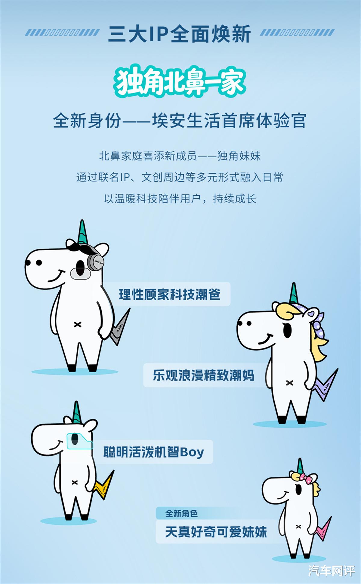 除此之外,埃安还焕新了两个老IP。陪伴用户快8年的“独角北鼻”,升级成“埃安生活首席体验官”,新增“独角妹妹”,更贴合千万埃安家庭气质,后续会通过联名、文创等形式融入日常生活。