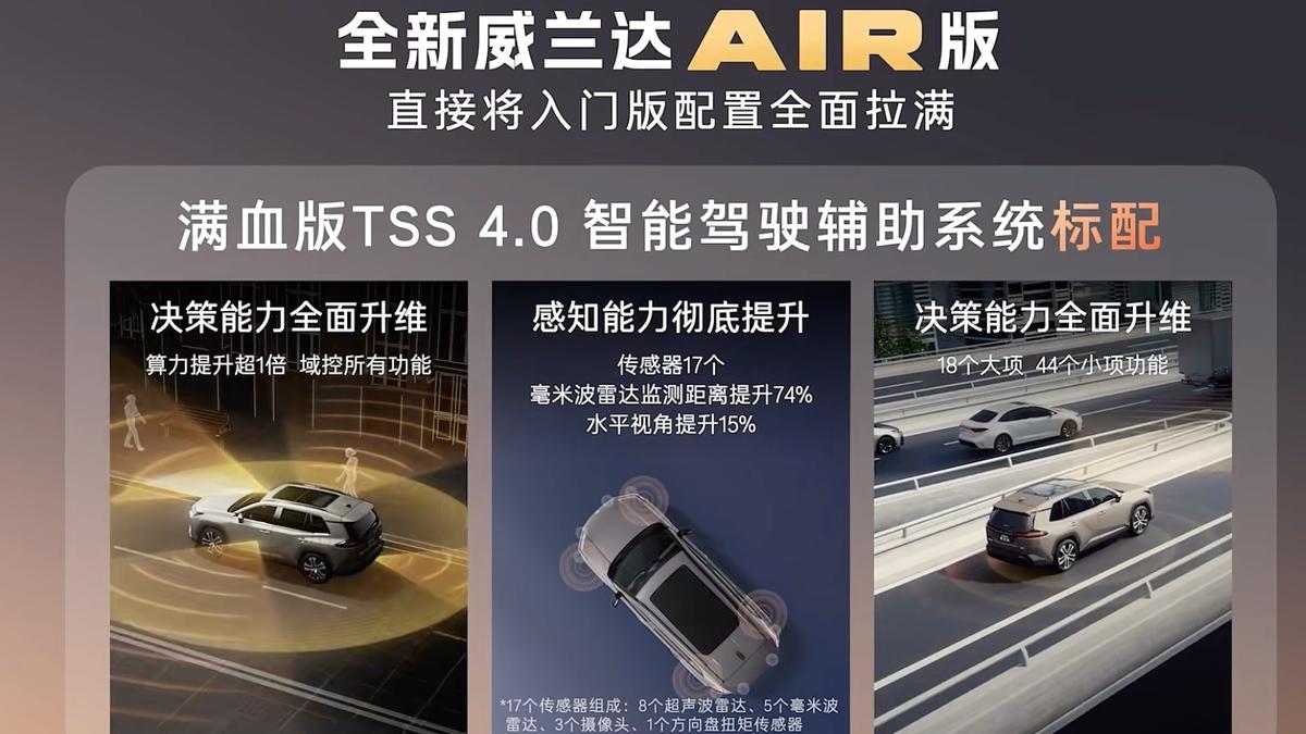 再看广汽丰田换代威兰达AIR版,它的落点也是对SKU的深度调整。把在2025年年末上市的入门价格下拉超过3万元之后,也把配置进一步补齐,正在改变丰田低配配置过低的传统认知。不过,好在这款车本身刚经历了换代,所以技术特征上有很多值得比较明显的亮点。