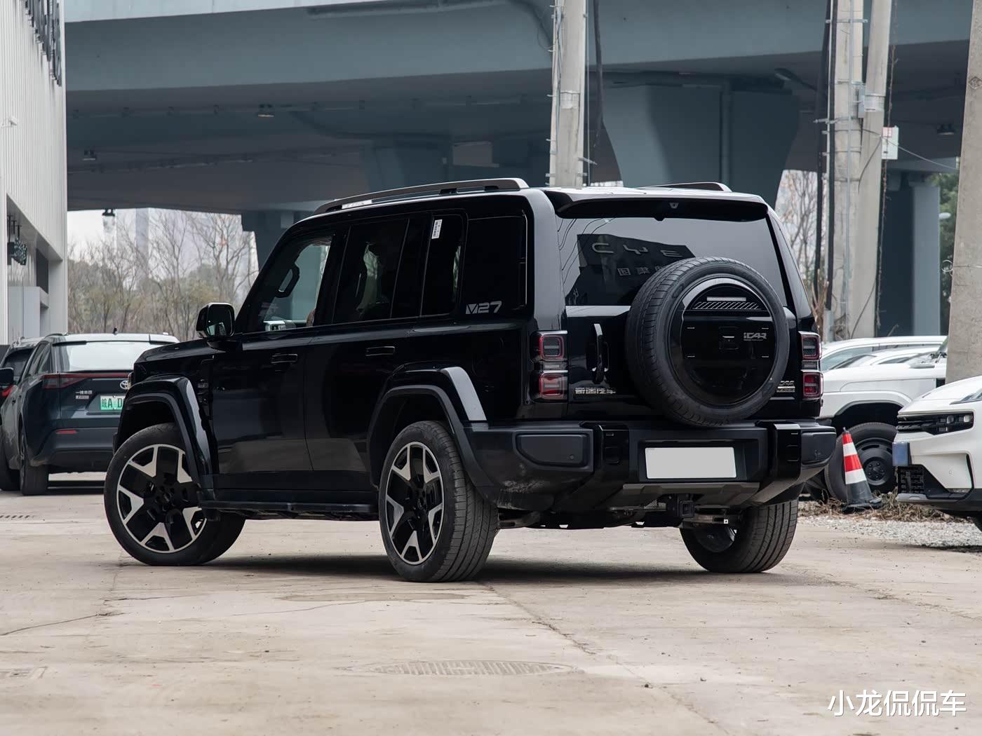 外观设计方面,iCAR V27整车的外观硬朗霸气,同时也不乏一定的时尚气息,想必这样的外观设计是比较能够符合当下大众主流审美的。车头部分,新车采用了方形大灯加外凸保险杠的设计,看起来复古且具有一定的“野性”。车身侧面,iCAR V27的设计比较简约,但粗壮的D柱外加“V27”的标识让整个车侧拥有了较高的辨识度。车尾部分,iCAR V27虽然不是越野车,但也依然采用了后挂备胎和侧开尾门这两个常出现在越野车上的设计,凸显了车尾的“越野感”。