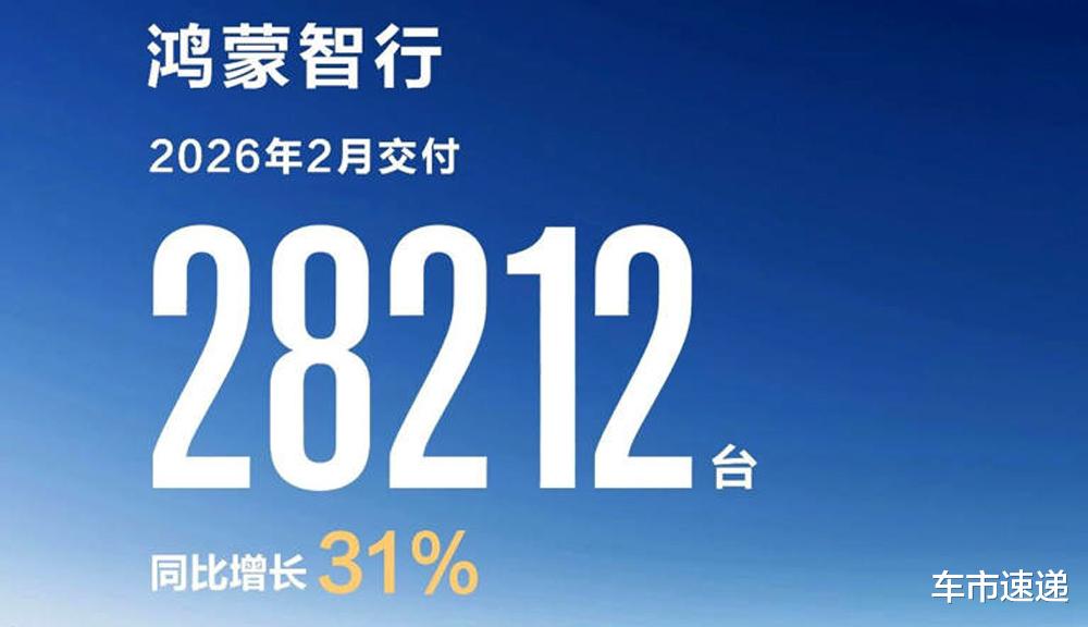 根据公开的销量显示,2026年2月,鸿蒙智行单月销量28212台,同比增长31%。